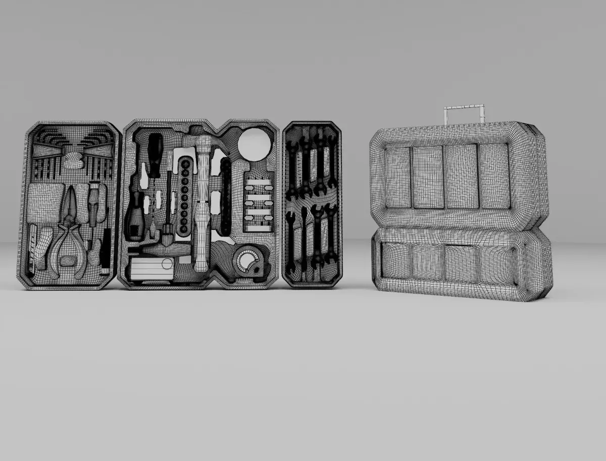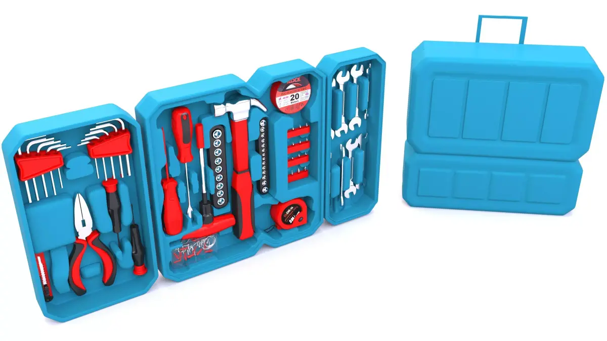 well-organized 3d modeltool kit neatly arranged in a blue plastic case. The tools arecategorized and placed in designated compartments, enhancingaccessibility and maintaining an orderly appearance. Here's a detaileddescription of the contents: