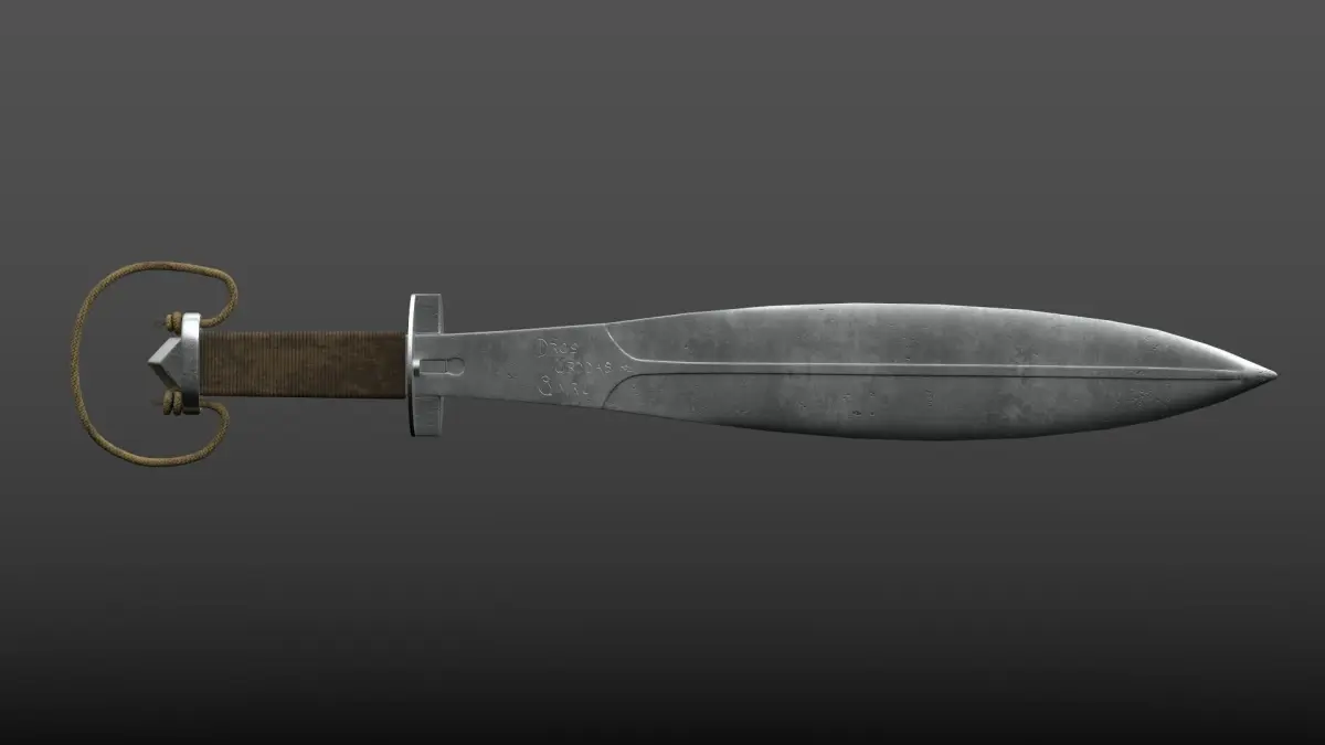 Welsh Knife 1916. The Welsh Knife was designed in 1916 by the sculptor and armourer Felix Joubert and patented by him, as a new or improved trench knife. It was allegedly based on an ancient Welsh weapon, although the existence of such a distinctly Welsh medieval sword has since been disproved. Knife has leaf-shaped blade with broad medial ridge expanding to form ricasso, circular handguard cranked and fitted to grip by a tumbler, which permits the handguard to lie flat when the weapon is sheathed, grip tang ends in blunt point, grip bound with cord. Blade have the inscription Dros Urddas Cymru (For the Honour of Wales).