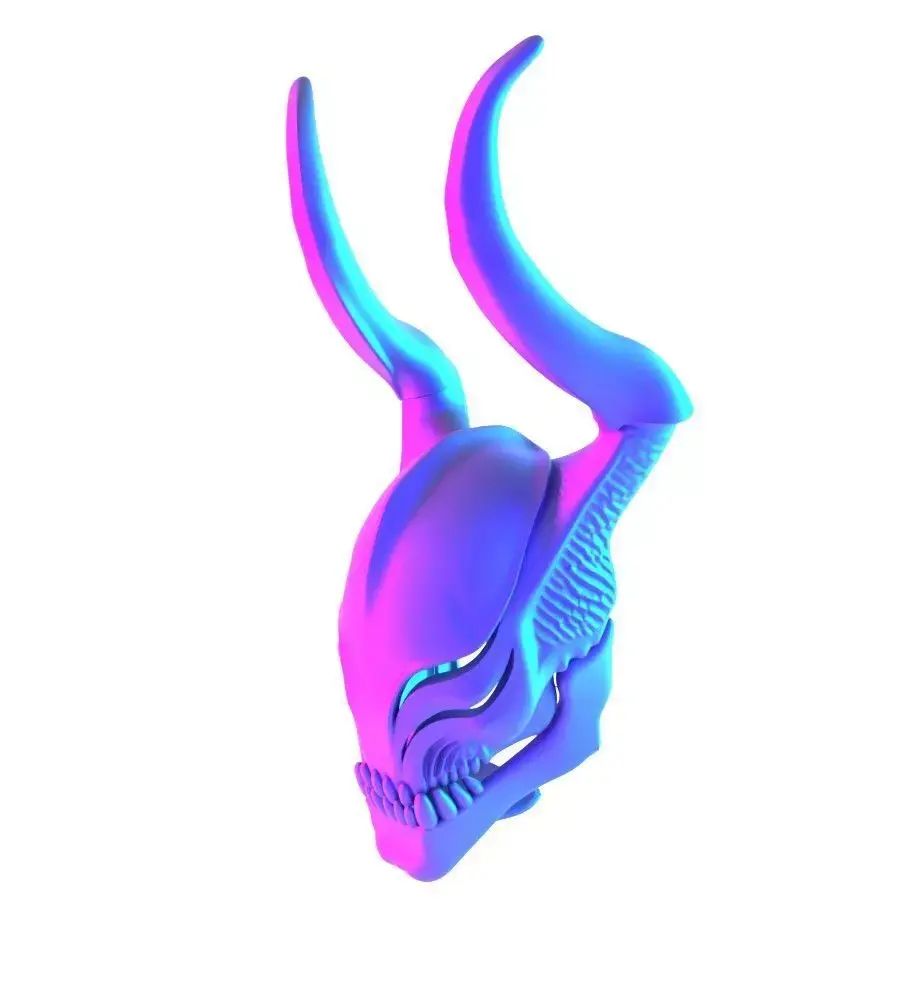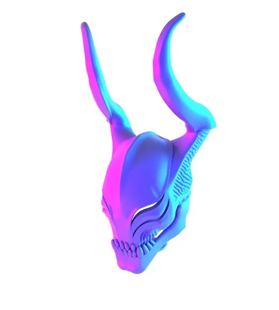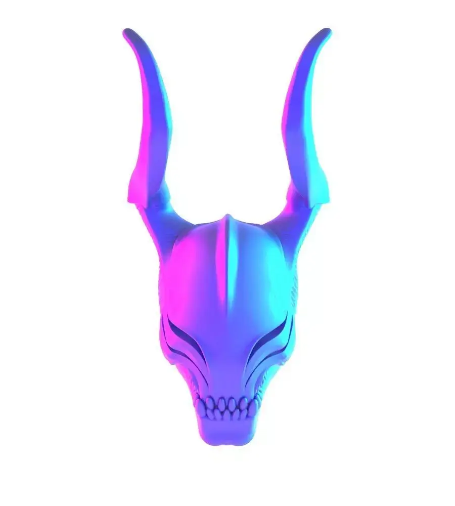 Wendigo Bone skull mask toy is a replica inspired by the Wendigo, a powerful mythical creature associated with winter and famine spirits. This wolf skull-shaped mask, sometimes available without horns, is made of corn-based bioplastic with a double varnish coating for durability. It is 3D printed, hand-painted, and features soft upholstery inside with a protective mesh over the eyes to prevent dust. Adjustable straps ensure a secure fit. It is designed as a cosplay item or costume accessory, evoking a scary and mystical forest demon appearance.