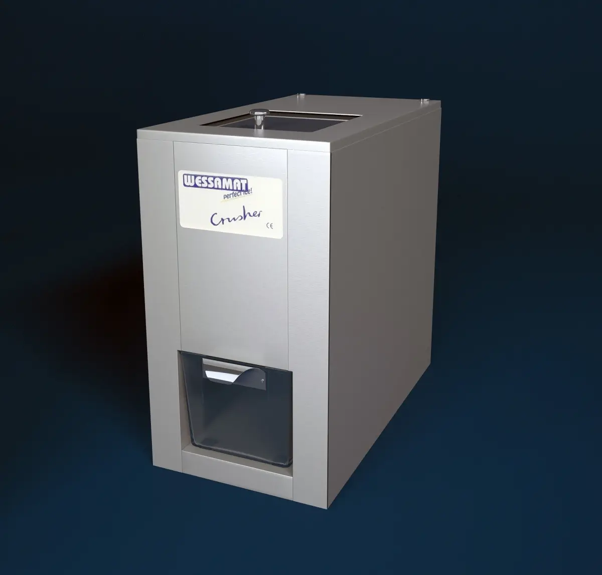 Good and clear ice is a figurehead for each gastronomic establishment. Excellent ice is aesthetic because ice cooled drinks and food is a special pleasure. Take crushed ice for presenting food. Furthermore it is very compact because the storage space is smaller than a DIN A4-sheet. Produce crushed ice according to requirements or have it in stock. Lift the filling covering up and put the ice cubes in the ice crusher. Whereby the ice cubes should do not be deep-frozen. The crushed ice drops into the white container which is removable. The machine produces up to 3kg crushed ice within one minute. Wessamat installed special cutting blades which protect the mechanic, the strain and the energy consumption get minimised.
