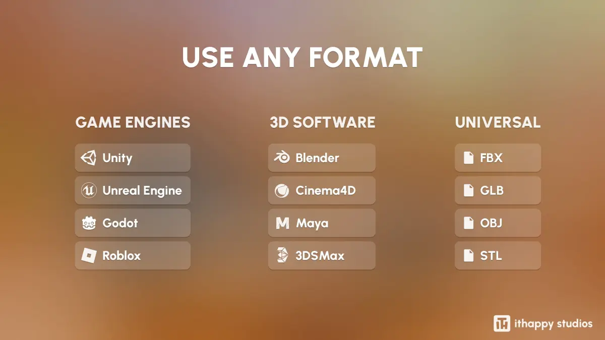 FILESYou’ll be able to download formats such as Unity Package, UE, Blender, C4D, Maya, 3DSMax, FBX, OBJ, GLTF, and STL.