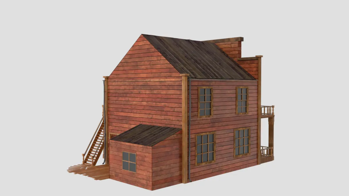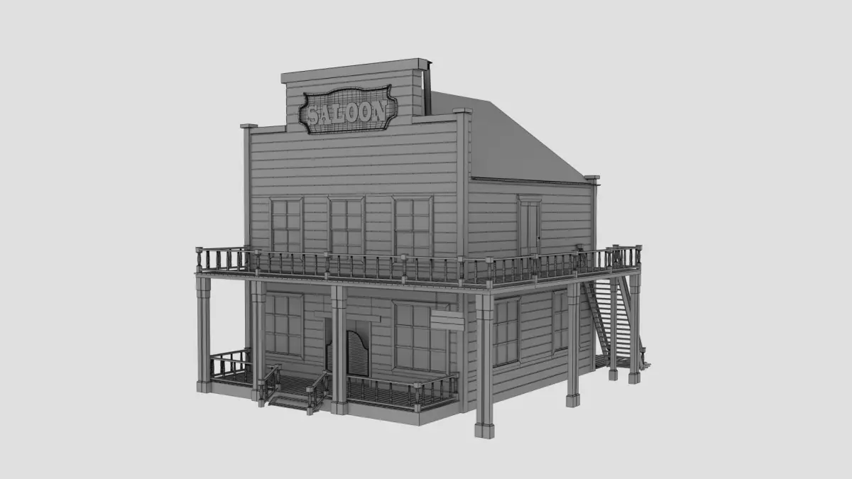 A 3D model of a classic Western saloon, meticulously designed with high-quality details and PBR materials to authentically capture the aged wooden walls, swinging doors, balconies, and rustic textures typical of the Old West. This iconic building is perfect for Wild West towns, cowboy-themed games, historical recreations, or cinematic environments, making it ideal for games, animations, and architectural visualizations.