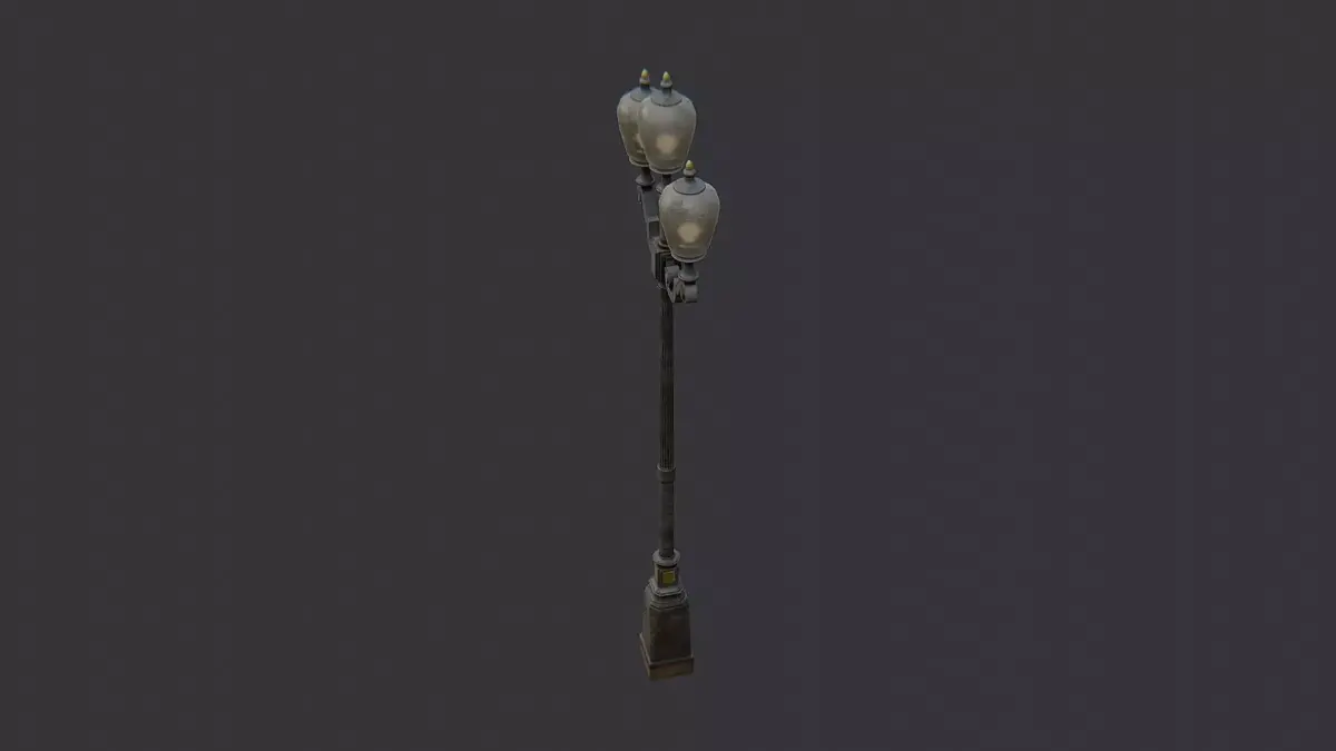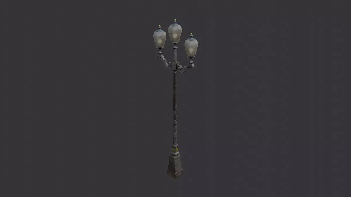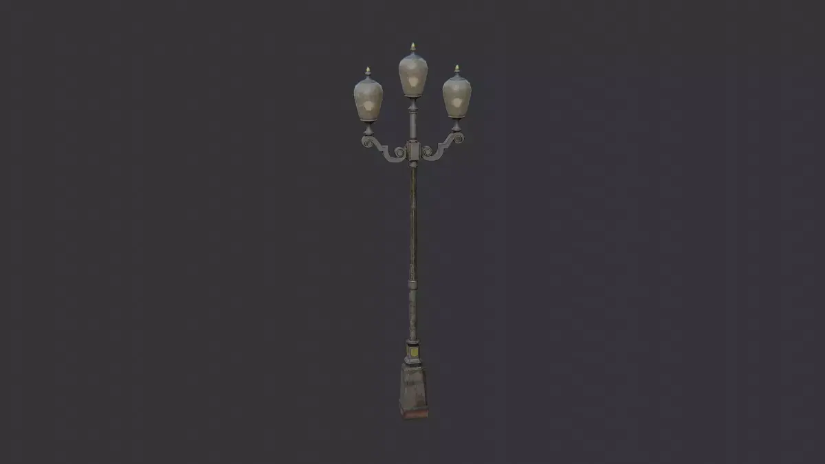 This exterior lamp post features a weathered metal pole and decorative lanterns with glass lenses. The wet material version adds realistic grime and damp textures for moody night scenes. Ideal for urban streets, parks, or historic district reconstructions. Includes two materials for metal and glass and clean UVs suitable for photoreal renders.