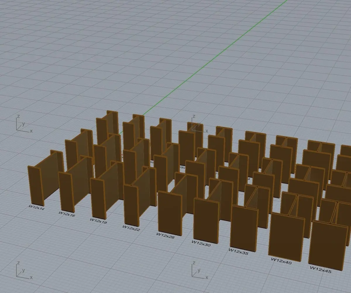 W8, W10 & W12 beams are included - (13)W8, (18)W10 and (29)W12. Each model offers a 1 ft solid, a section profile with hatching and size label. All size dimensions are from AISC Manual of Steel Construction.