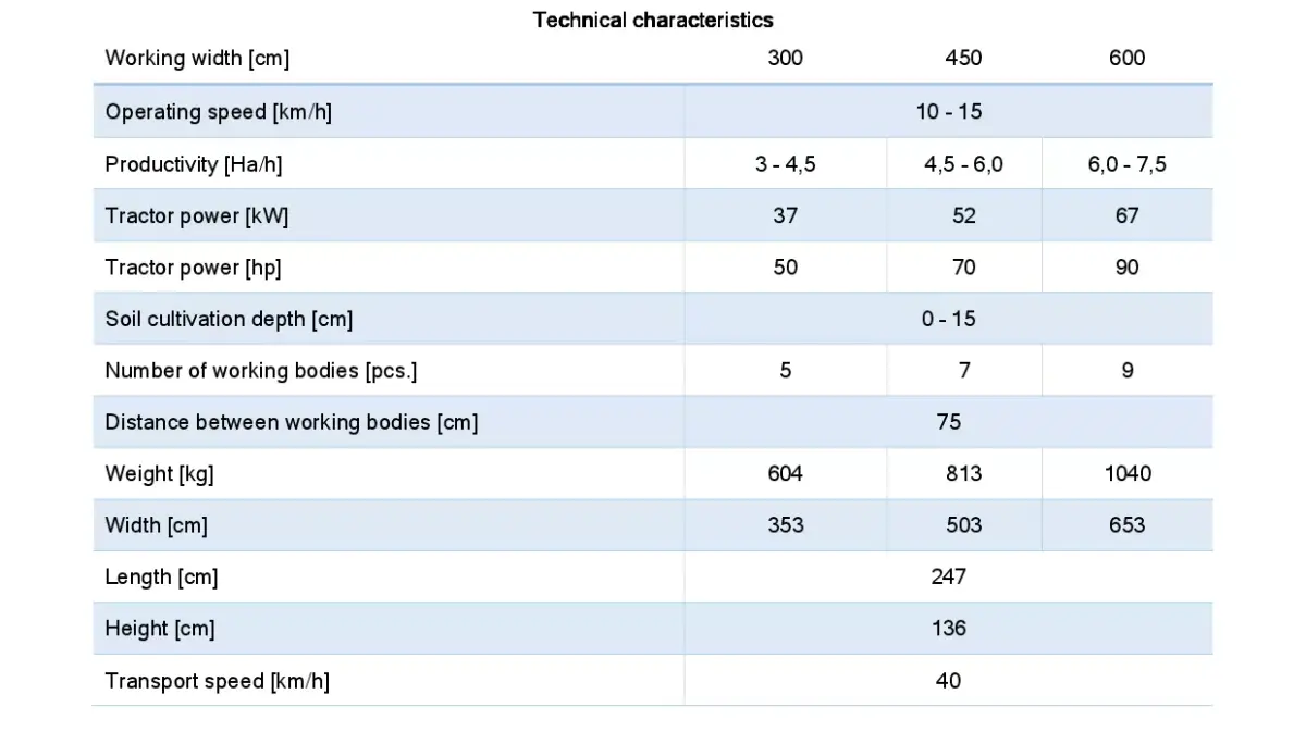 The row crop cultivator is built on a rigid frame with a versatile section adaptable for various crops, including sunflower, maize, soybean, and sugar beet. Its durable tines ensure efficient inter-row soil cultivation, controlling weeds and improving aeration. Designed for medium-sized tractors, it allows precise and uniform soil preparation without damaging the crop. A reliable tool for farmers seeking flexibility and high performance in row-crop cultivation