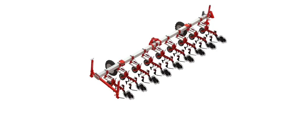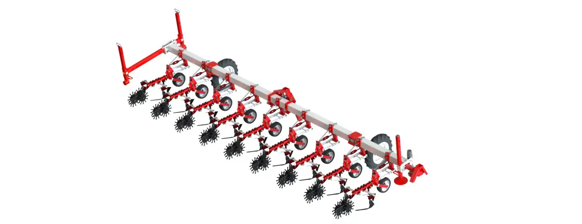 The row crop cultivator is built on a rigid frame with a versatile section adaptable for various crops, including sunflower, maize, soybean, and sugar beet. Its durable tines ensure efficient inter-row soil cultivation, controlling weeds and improving aeration. Designed for medium-sized tractors, it allows precise and uniform soil preparation without damaging the crop. A reliable tool for farmers seeking flexibility and high performance in row-crop cultivation