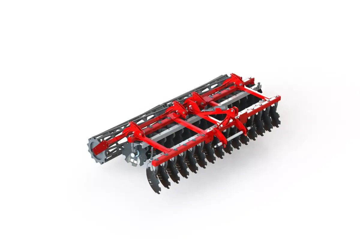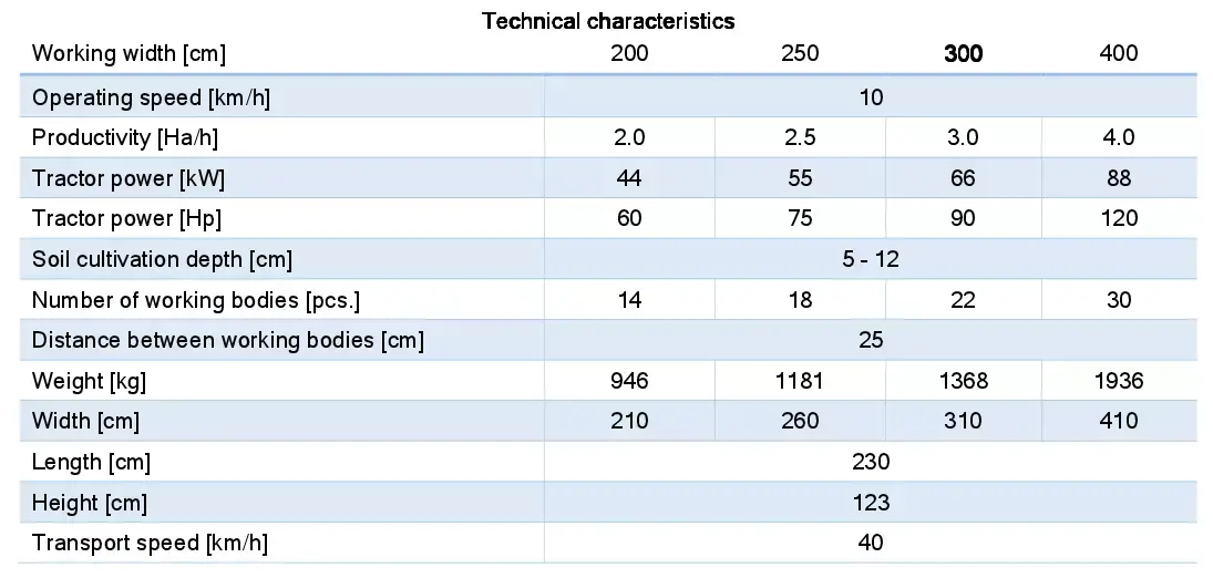 The mounted heavy disc harrow is designed for resource-saving soil cultivation for cereals, industrial, and fodder crops. It efficiently controls weeds, crushes crop residues, levels the soil, and provides light compaction. Suitable for soil with up to 27% moisture and hardness up to 3.5 MPa, as well as fields with high residue content, it ensures consistent and high-quality preparation of the seedbed. A reliable tool for medium and large-scale farming operations.