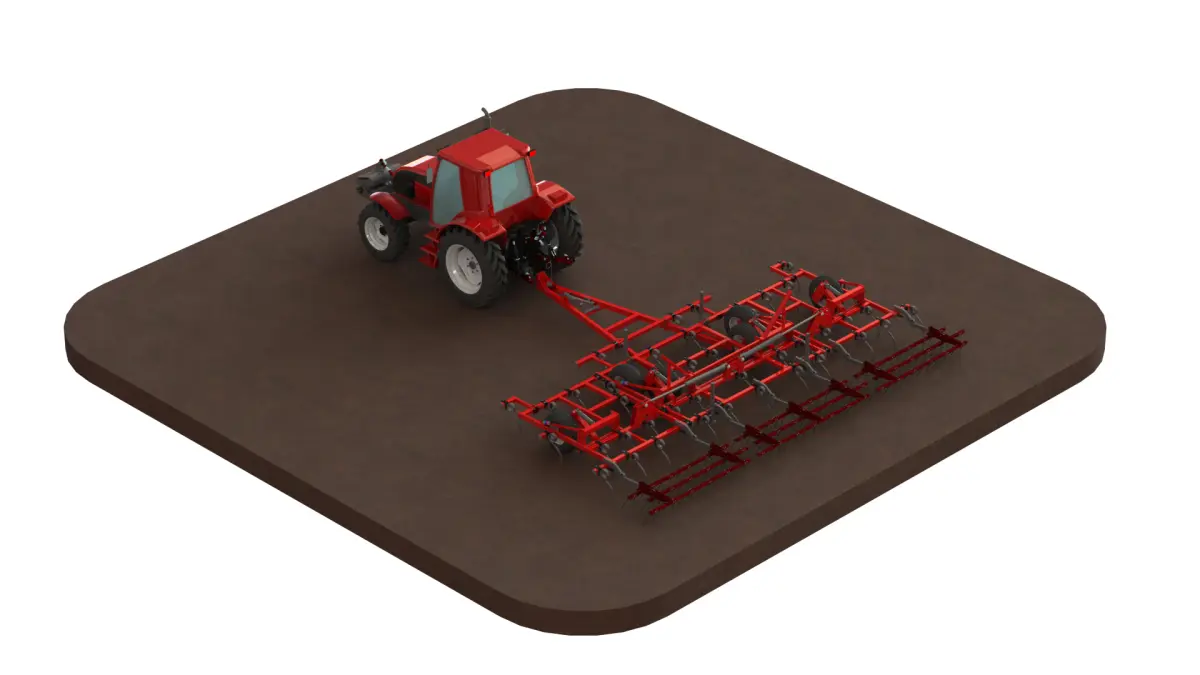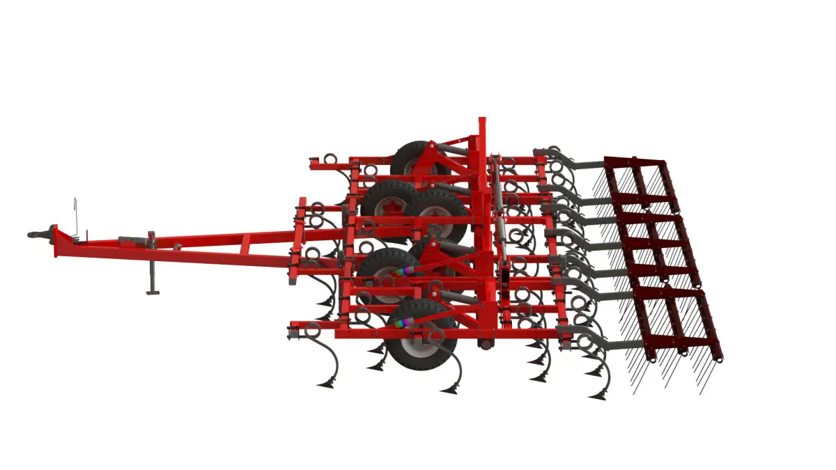 Field Cultivator – is a soil cultivation implement designed for seedbed preparation and general field tillage. Field cultivators can also be used for secondary tillage to control weeds.The field cultivator is available in various working widths (4, 6, 8, or 10 meters). The 6, 8, and 10-meter models have a three-section folding frame for easier transportation. Key features include S-shaped or C-shaped spring tines with sweeps up to 250 mm wide, optional attachments such as three rows of tine harrows, and tandem wheels for improved ground contour following. Specific models may vary in specifications and dimensions depending on the configuration.The unique frame design allows for extensions to increase the working width, or for reducing the overlap between the sweeps to lower the tractor's power requirements and/or save fuel consumption.Five rows of working elements provide excellent soil loosening and complete weed cutting. The tines are mounted with a single bolt, allowing for quick and easy replacement. Precise depth adjustment of the sweeps is achieved by installing aluminium stops on the hydraulic cylinder rods, both on the wings and on the main frame.The tine shanks are equipped with spring protection to prevent damage. The implement’s wheels are mounted on tandem supports, which allow it to better adapt to field irregularities and ensure smooth transportation. The three rows of spring harrows perfectly level the soil surface, thus providing optimal seedbed preparation.