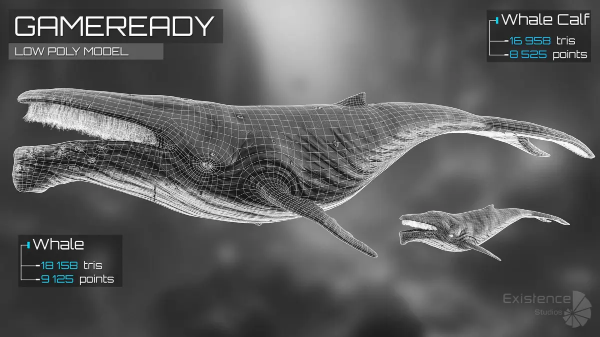 - Polycount: / Whale - 18 158 Tris | 9 125 Points/ Whale Calf - 16 958 Tris | 8 525 Points/ Baleen - 10 750 Tris | 12 196 Points