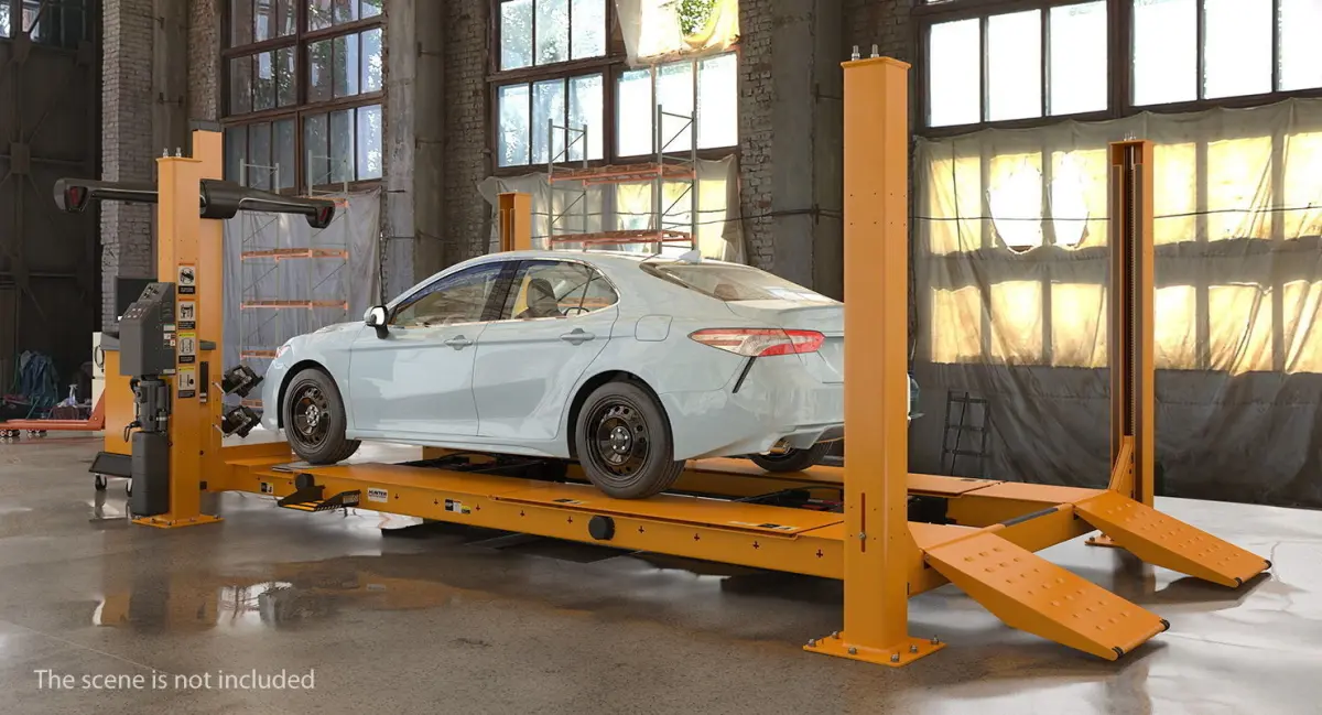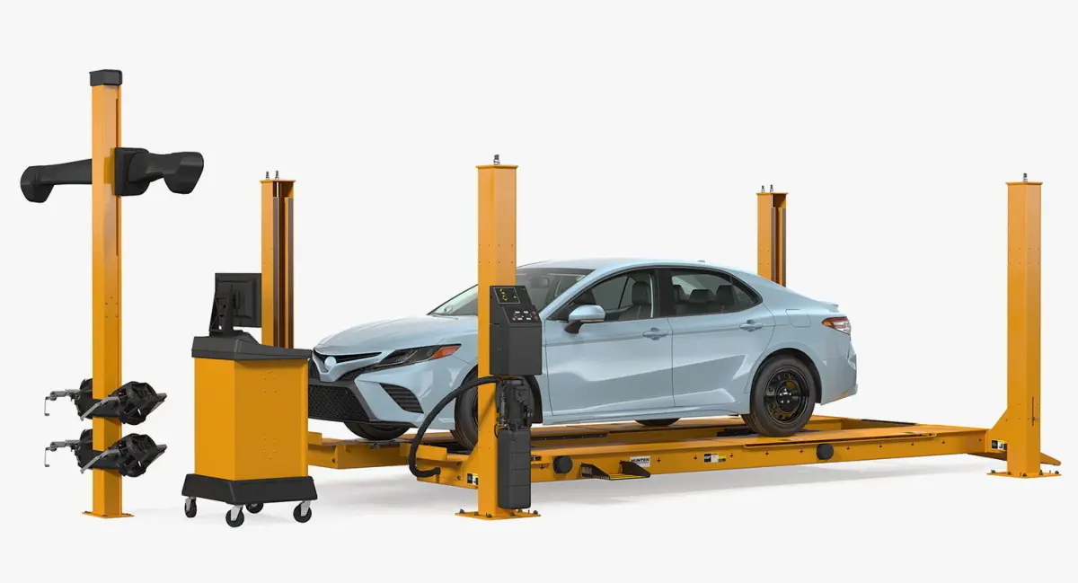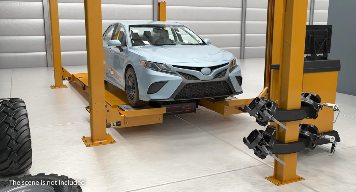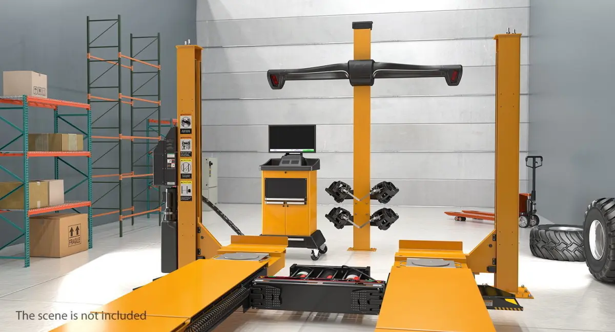 *Wheel Alignment Equipment Generic with Car, 4 Post Car Lift maintenance device, alignment equipment for the precision vehicles repair, and computer console for computerized car repair system. *