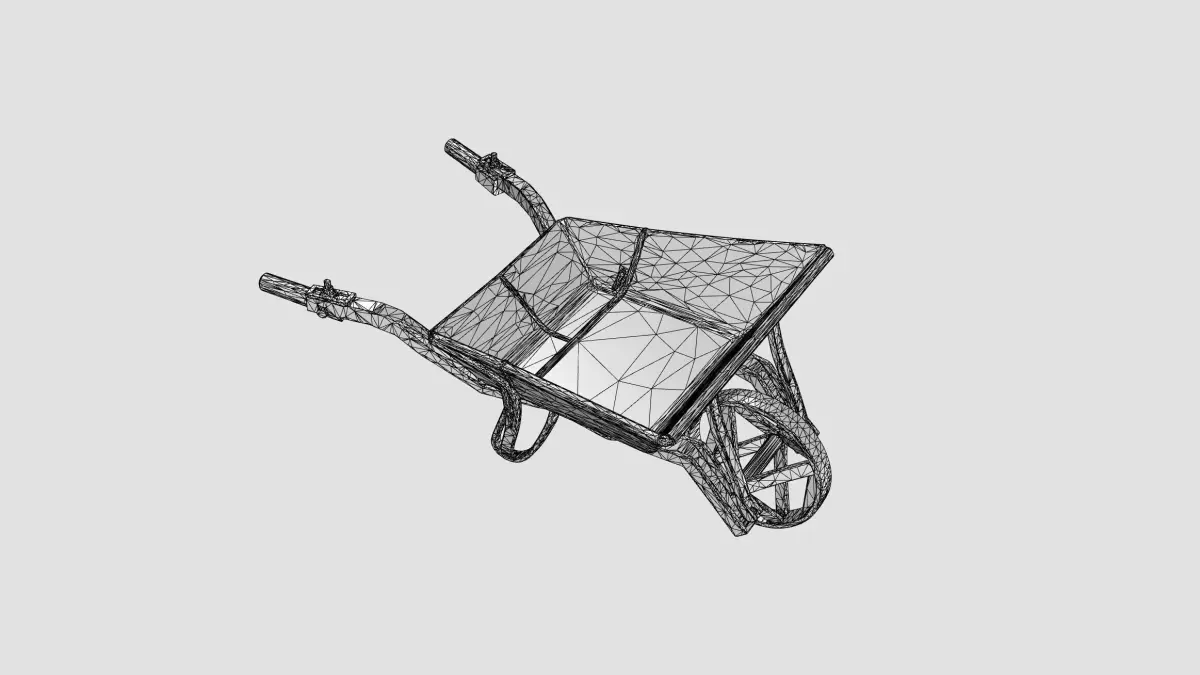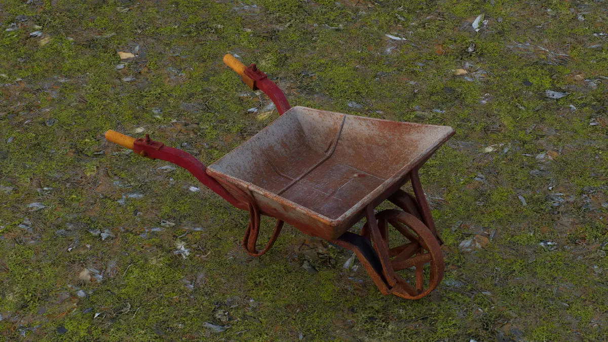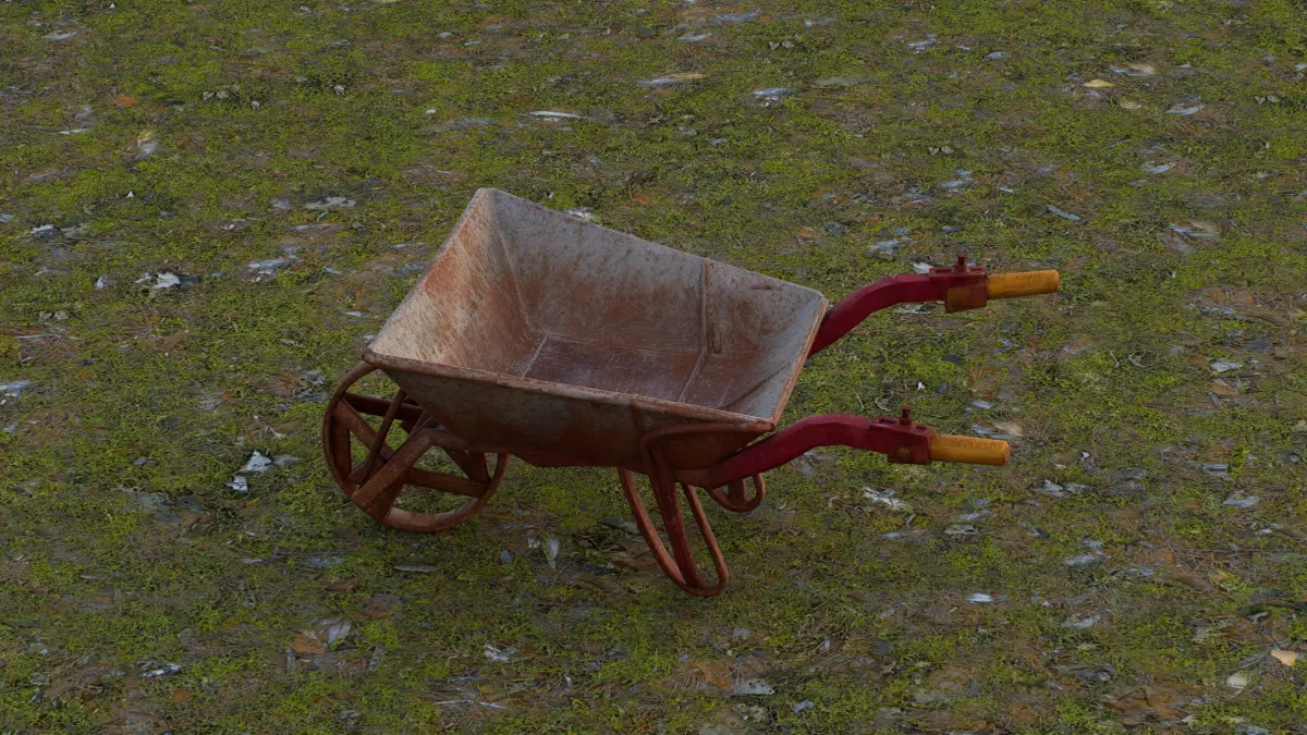 This 3D low-poly model depicts an old, weathered wheelbarrow, designed with a minimal polygon count for efficient use in real-time applications like games or historical simulations. The model features a rusted metal body, red handles with orange grips, and a single wooden wheel, capturing a rustic, aged aesthetic. Its lightweight design and detailed texture make it perfect for rural scenes, construction settings, or educational projects.