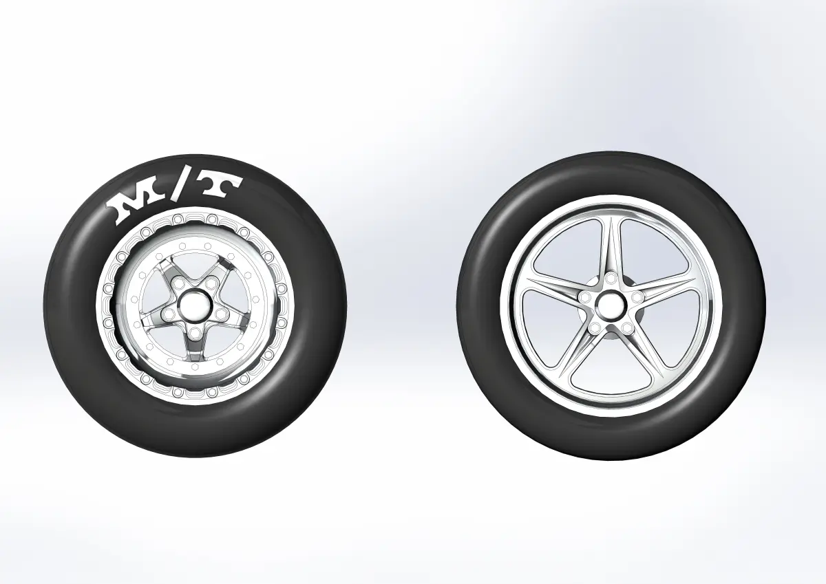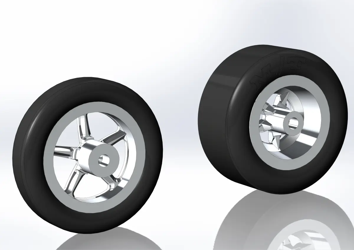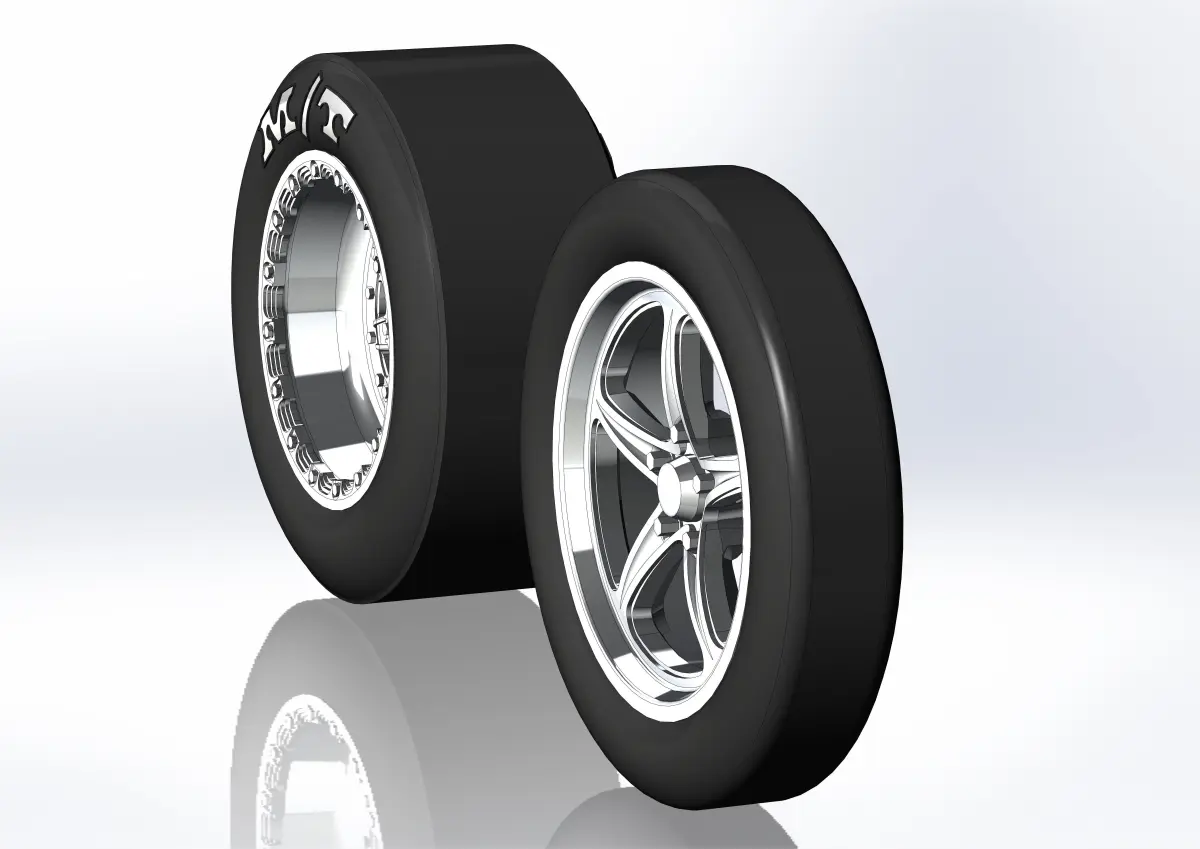 3D-printable wheels for scale model, rims and tyres separately . Rims - Keizer Verbrand: rear 15x9, front 17x4; Tyres: rear 25/9.5-15, front 26/4,5-17