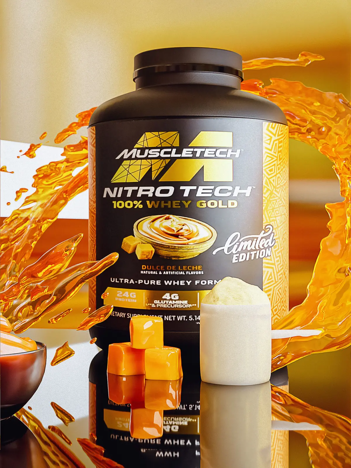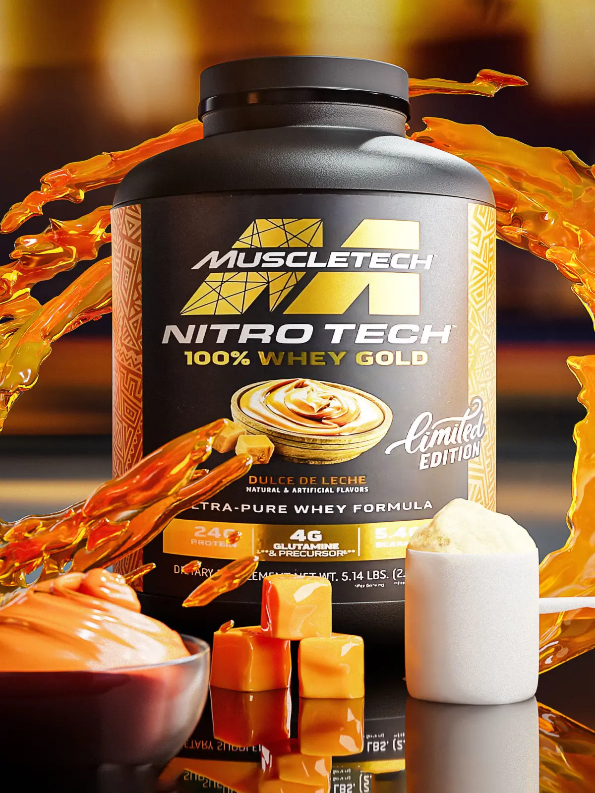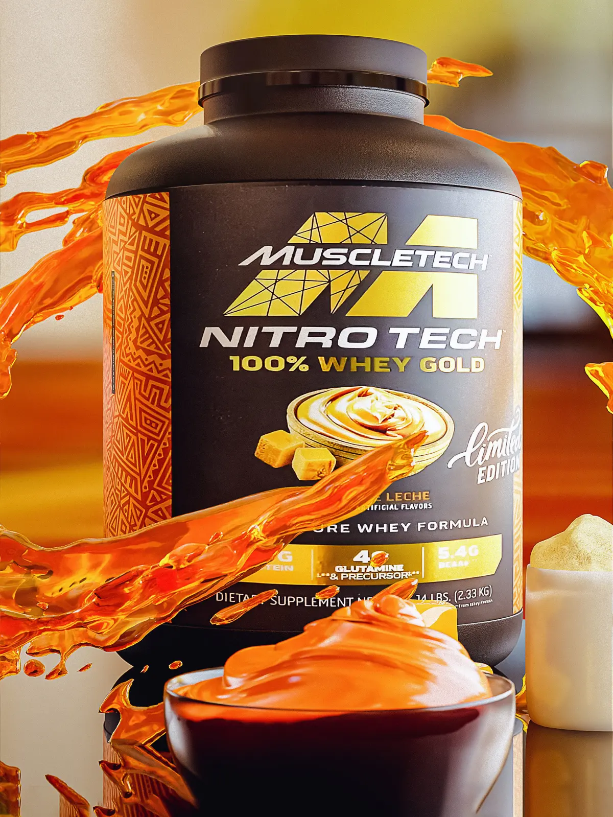 Whey Protein Bundle (Muscle tech ) . including whey protein that you can change the label , whey inside . powder mesh and material . scoope . shaker and caramel mesh and a fluid mesh .
