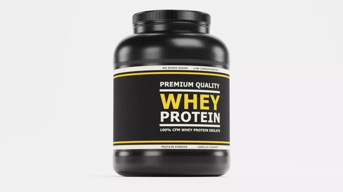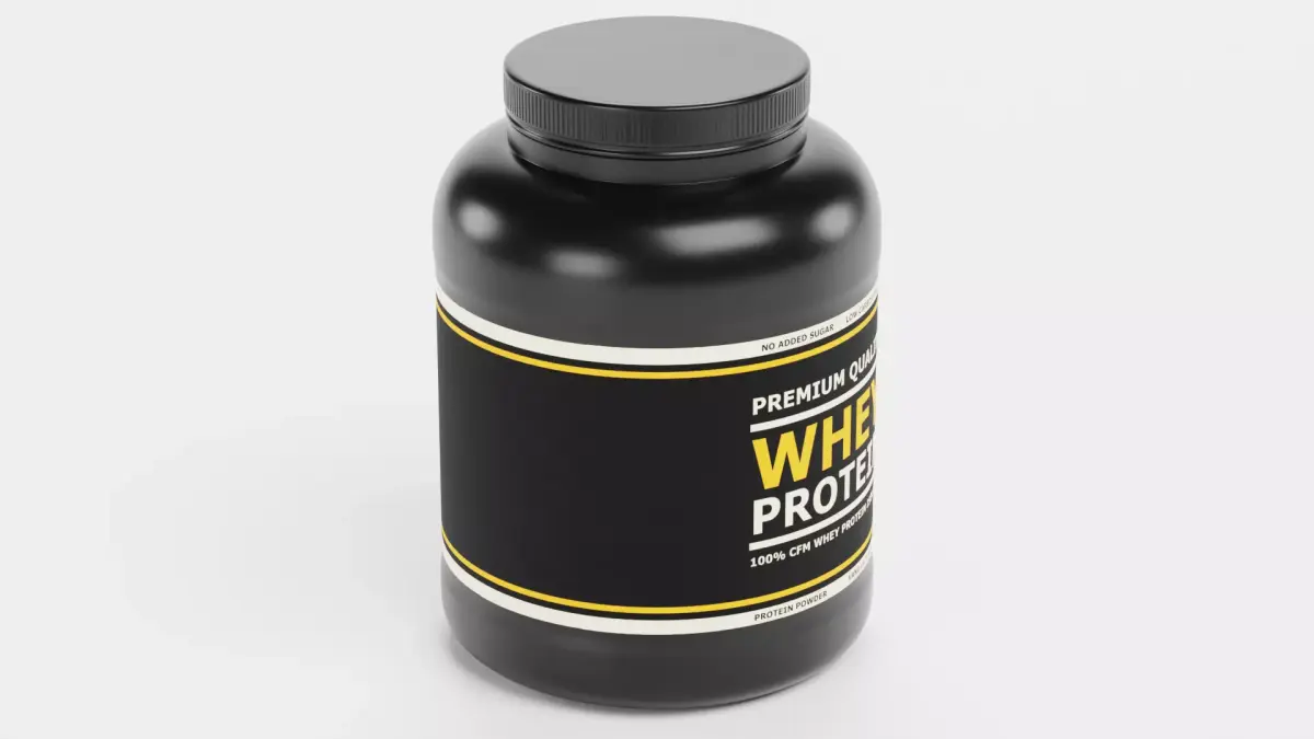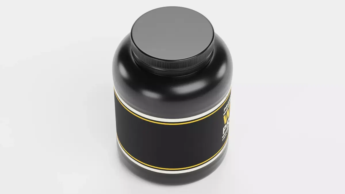 A realistic 3D model of a screw-top Whey Protein container designed as a brand-neutral supplement container with clean proportions and a production-ready look. This concept emphasizes modern, minimal design and accurate form factor, representing a timeless, professional packaging aesthetic for sport nutrition packaging – without any brand association.