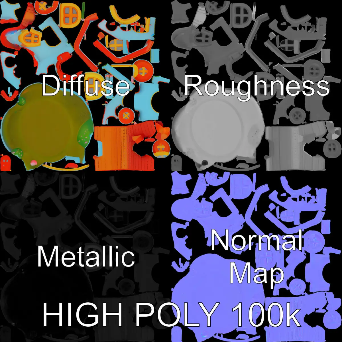 This Whimsical Cartoon House Model Pack includes three levels of detail: low-poly (1000 triangles), middle-poly (10,000 triangles), and high-poly (100,000 triangles), making it ideal for various applications such as animations, game design, architectural visualization, and virtual reality experiences. The model features colorful textures with PBR, Diffuse, NormalMap, and reflection/roughness/metallic maps, all at 4096x4096 resolution. It is fully compatible with modern rendering engines and game engines like Unity and Unreal. Unwrapped UVs ensure no overlap, guaranteeing a clean and efficient model. A perfect addition for any creative project seeking charm and playfulness.