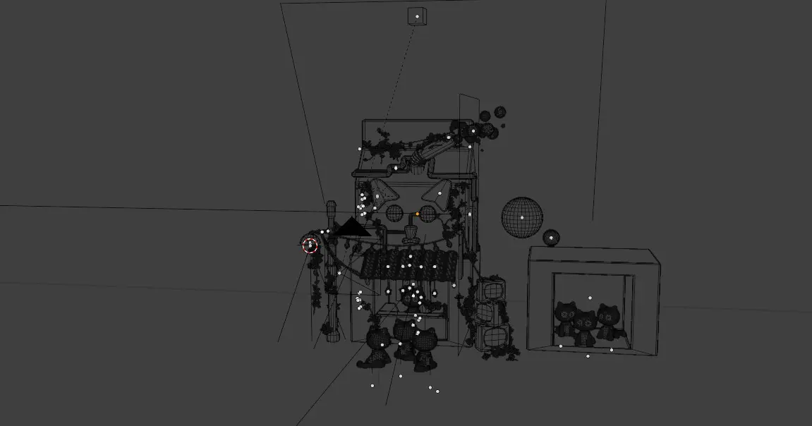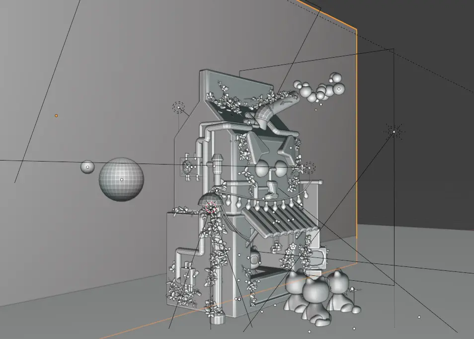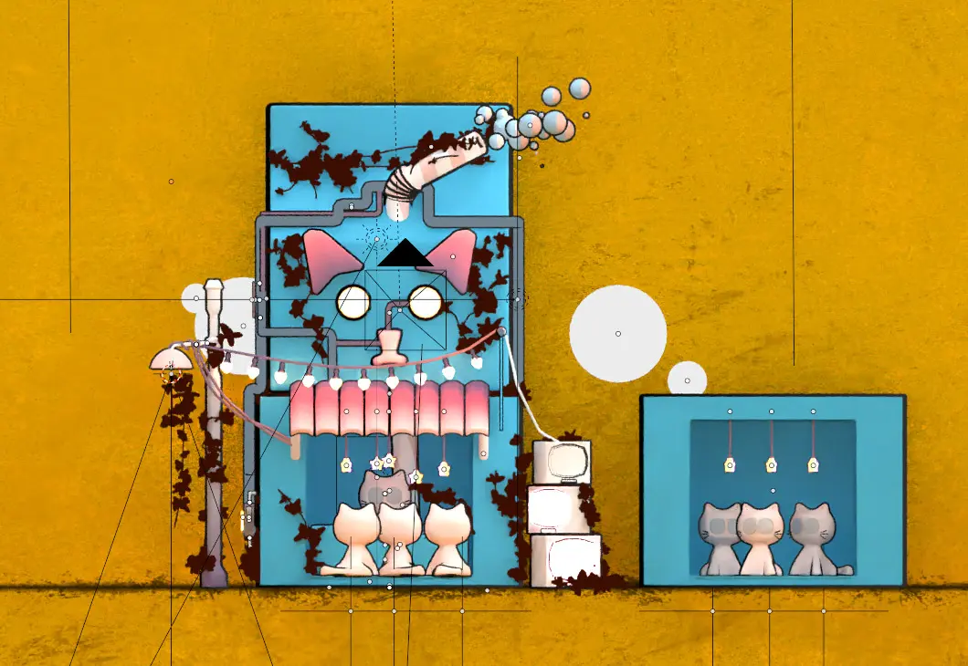 This unique and stylized 3D scene showcases a whimsical robot-themed marketplace filled with adorable cat-like characters. The central robot structure features expressive facial elements, a striped awning, and whimsical details such as bubble pipes and a surrounding string of lights. A smaller display box to the right houses more of the charming figures under soft hanging bulbs, evoking a cozy storefront vibe. Set against a vivid yellow background with rich texturing and dramatic reflections, this scene is perfect for use in storytelling, concept art, games, or collectible NFT design.