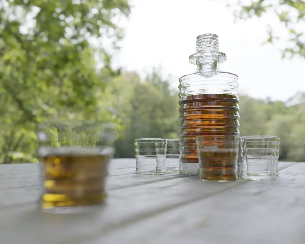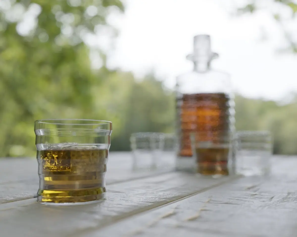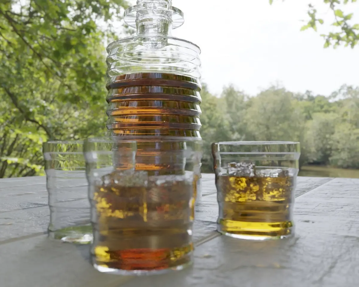 Decanter: 11,204 verts and 11,340 facesGlass: 2.486 verts and 2,520 facesIce cube: 18,182 verts and 18,200 faces - High poly for the more reallistic look, deletableWhisky liquid (Glass): 938 verts and 972 facesWhisky liquid (Decanter): 1,730 verts and 1,728 faces