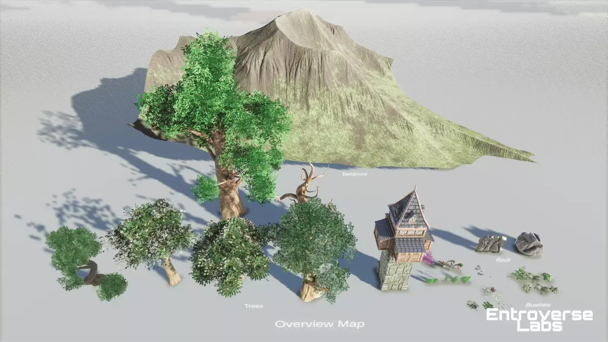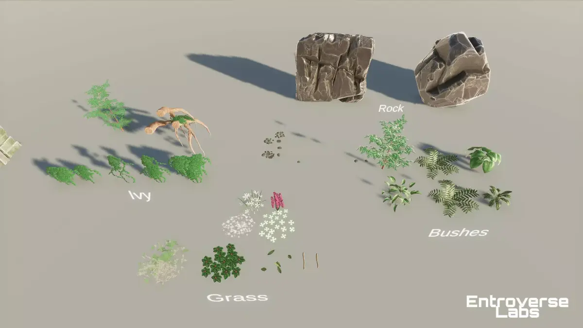 Diverse Range of Shrubs, Bushes, and Small Trees: Whether you're designing a tranquil garden or a dense woodland, this pack offers a variety of foliage assets that bring richness and variety to your scene.High-Resolution Textures and Materials: Enjoy top-quality textures and materials that ensure your environments look stunning and realistic from every angle.Optimized for Performance and Real-Time Applications: Despite the high level of detail, these assets are designed with optimization in mind, ensuring smooth performance for real-time applications without sacrificing visual quality.Easy Integration with Unreal Engine Projects: Our pack is designed for seamless use with Unreal Engine, allowing you to easily integrate and begin crafting your world without hassle.Customizable Foliage Variations for Unique Designs: Tailor the appearance of each element, whether it's adjusting the color of leaves or creating a unique arrangement, giving your environment a personal touch.Showcase Level Included: The pack comes with a pre-built showcase level, demonstrating the full potential of the assets and helping you get started quickly.Updated by Entroverse Labs, where creativity meets nature, this pack is a perfect choice for game developers and environment artists looking to elevate their natural scenes.