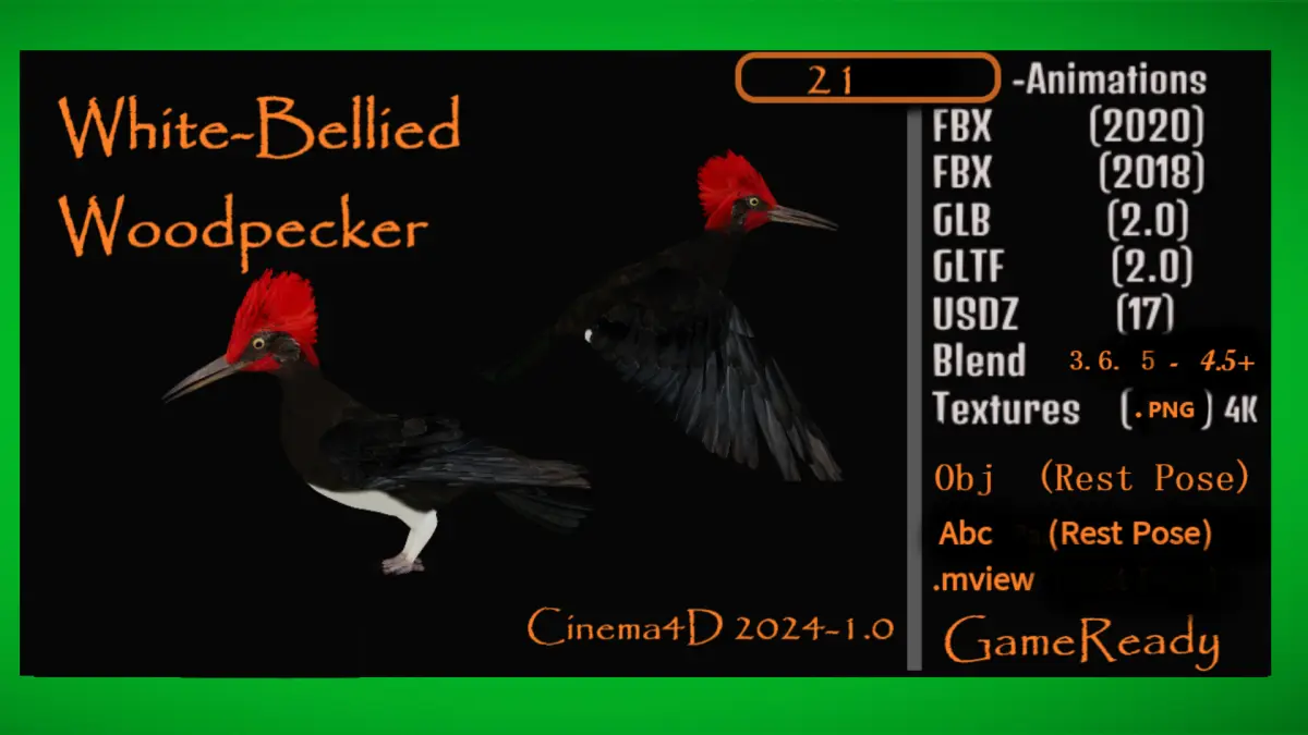 The white-bellied woodpecker or great black woodpecker is a woodpecker species inhabiting evergreen forests in tropical Indian subcontinent and Southeast Asia. It is among the largest of the Asiatic woodpeckers and nests in large dead trees, often beside rivers...3D White-bellied Woodpecker bird Model By Nyilonelycompany (nyc).