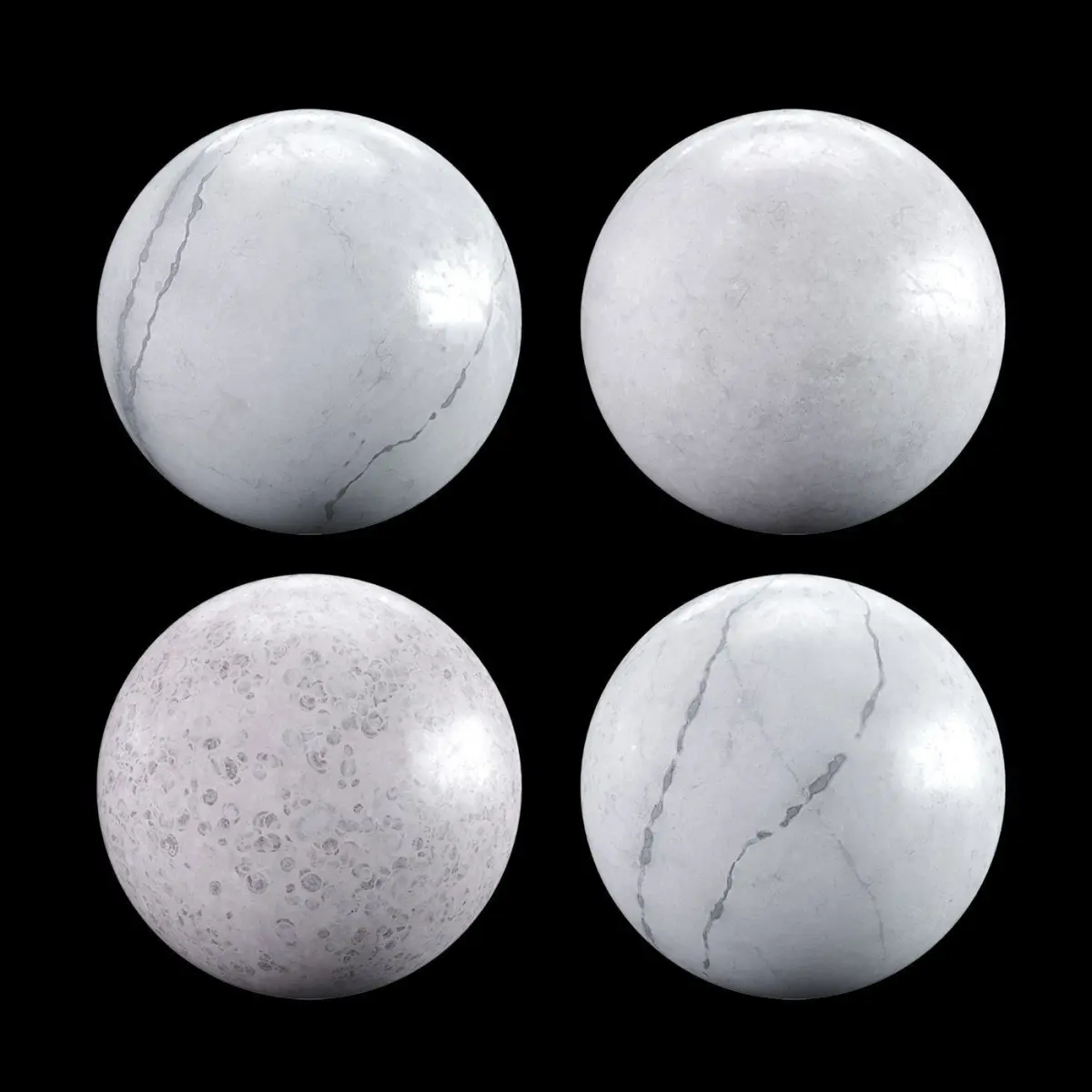 - White Carrara Marble PBR Metallic Material (Blender Cycles, Arnold, Cinema 4D, Unreal, Unity): Albedo, Metallic, Roughness, Normal, Displacement