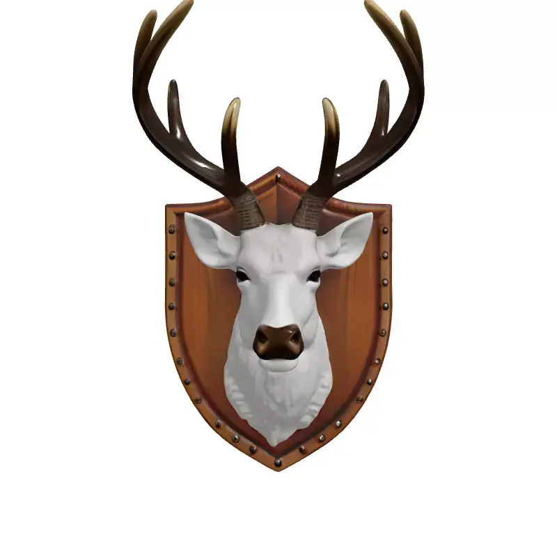Presenting a meticulously crafted 3D model of a classic deer head wall mount trophy, ideal for adding a rustic yet elegant touch to any digital environment. This highly detailed asset features a striking white deer head with intricately sculpted fur textures, complemented by robust, bronze-finished antlers. The head is proudly displayed on a beautifully rendered wooden shield plaque, complete with subtle wood grain and decorative metallic studs along its border, enhancing its authentic appearance. This versatile model is perfect for a wide range of applications, including interior design visualizations for lodges, cabins, or traditional homes, and as a sophisticated prop within game development for themed levels or virtual reality (VR) experiences. It also serves as an excellent decorative element in architectural visualizations, digital art compositions, or animated shorts. The model comes fully UV unwrapped with PBR (Physically Based Rendering) textures, ensuring realistic material representation under various lighting conditions. Its clean topology is optimized for both static renders and could be easily adapted for real-time performance with appropriate LODs. Supported formats include GLB, OBJ, FBX, STL, DAE, USD, ABC, and PLY, providing maximum compatibility across major 3D software and engines. This asset is ready to be integrated into your projects to elevate their visual fidelity and immersive qualities.