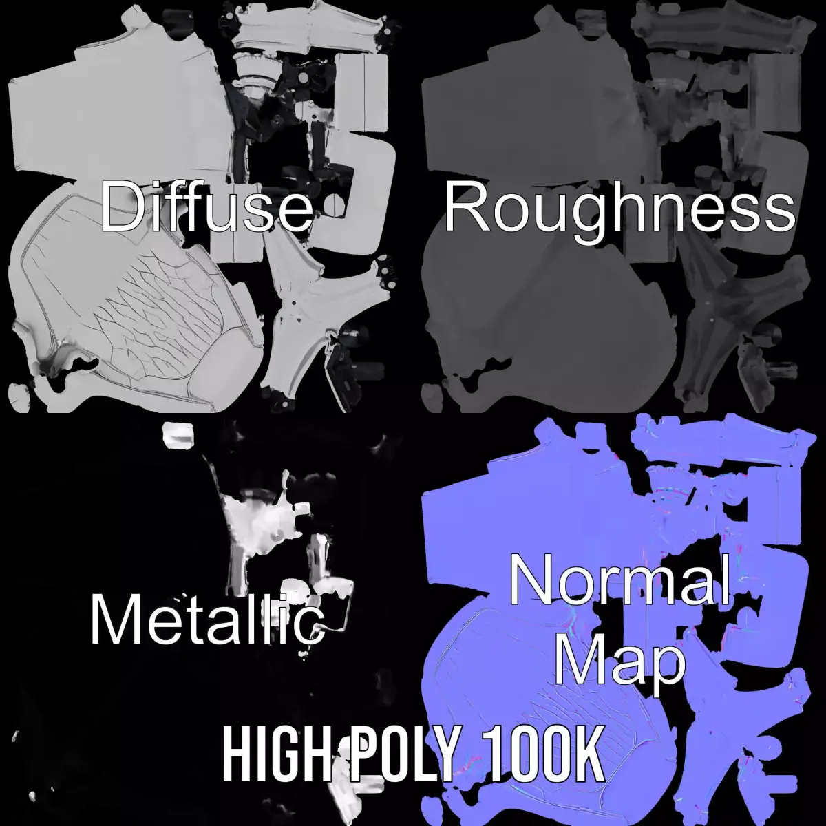 The chair's textures are PBR, including Diffuse, NormalMap, and reflection/roughness/metallic, suitable for modern rendering engines. Models are accurately unwrapped with no overlapping UV, ensuring quality and performance.
