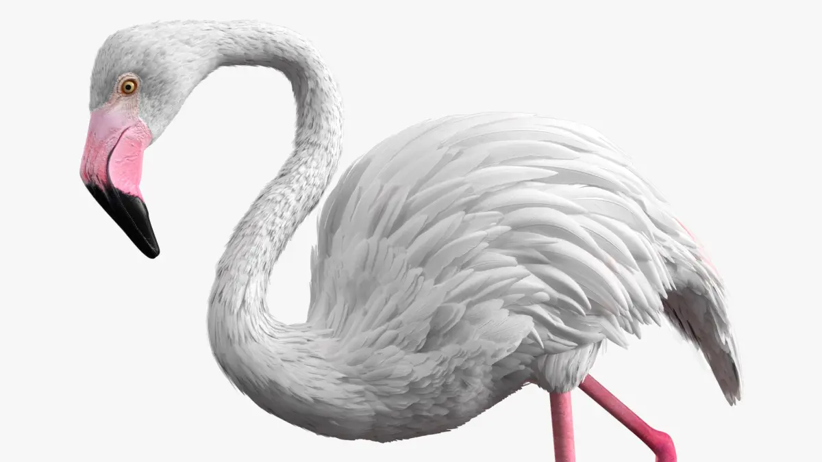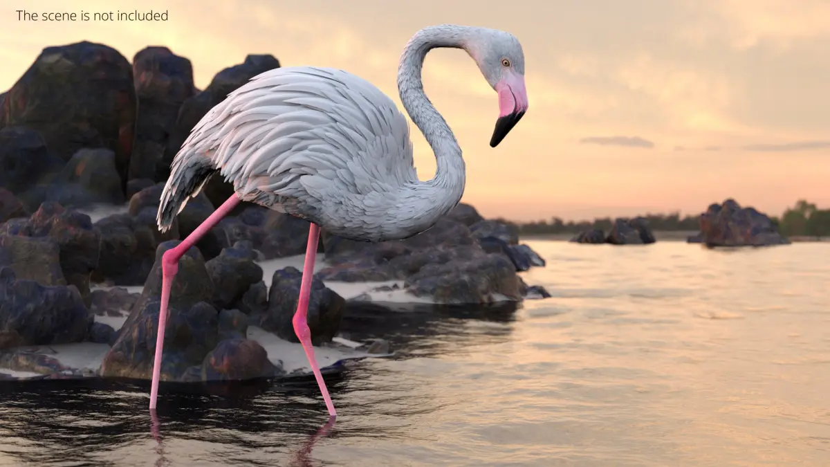 White Flamingo Bird in Walking Pose is a three-dimensional model of large wading bird, that is a distinctive species recognized for its pink plumage and long legs.