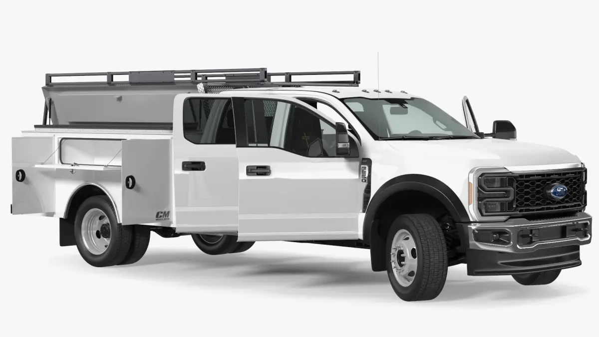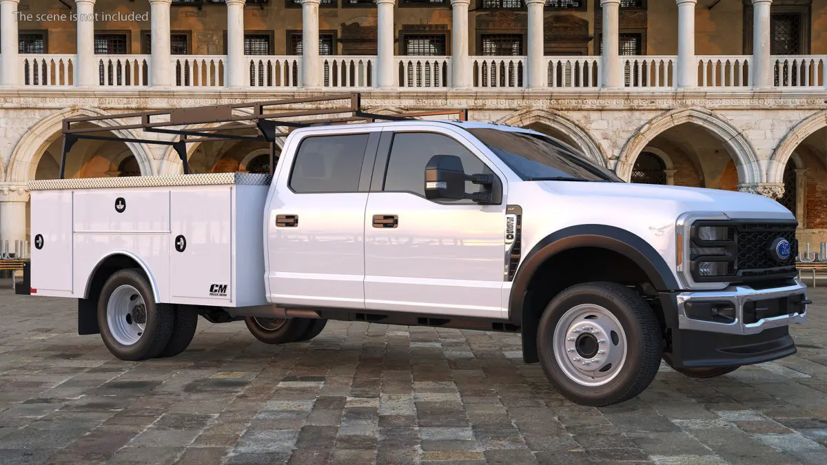White Ford Super Duty F550 with Service Body Rigged is a 3D model of Ford F-550 pickup which is a full-size chassis cab pickup vehicle in the Ford F-Series Lineup, and which was manufactured by Ford in the United States. Modern F-550 heavy-duty pickup (medium-duty truck) that belongs to Ford's Super Duty lineup, and which has impressive towing and payload capacities, making it suitable for heavy-duty work, and which features a reinforced frame and suspension components to handle heavy loads. Powerful Ford Super Duty F-550 pickup truck which is specifically designed to handle even more demanding tasks and which has greater towing and hauling capabilities. Specifically designed Ford Super Duty F-550 pickup truck which can be used for applications such as construction, towing and hauling heavy loads, utility work, and specialized professional uses. For commercial pickup type vehicles, car industry, car making technologies, modern light trucks, delivery carriers, car making technologies, medium duty trucks, modern car machinery, modern commercial cars, freight transport vehicles, auto service transport, car engineering, car concepts, light duty trucks, and cargo transport promotional projects.