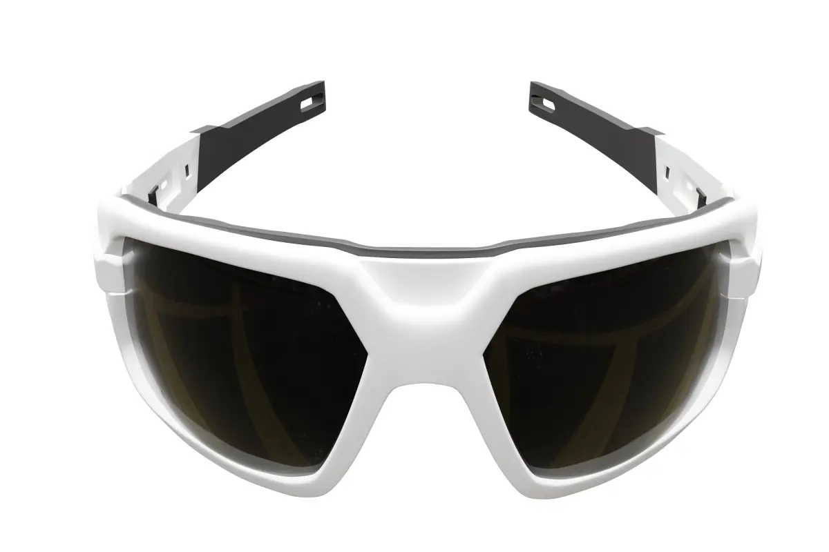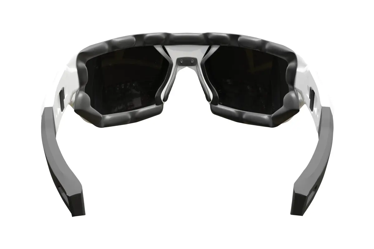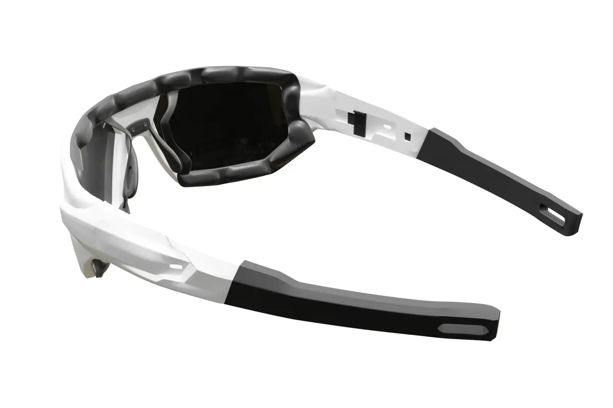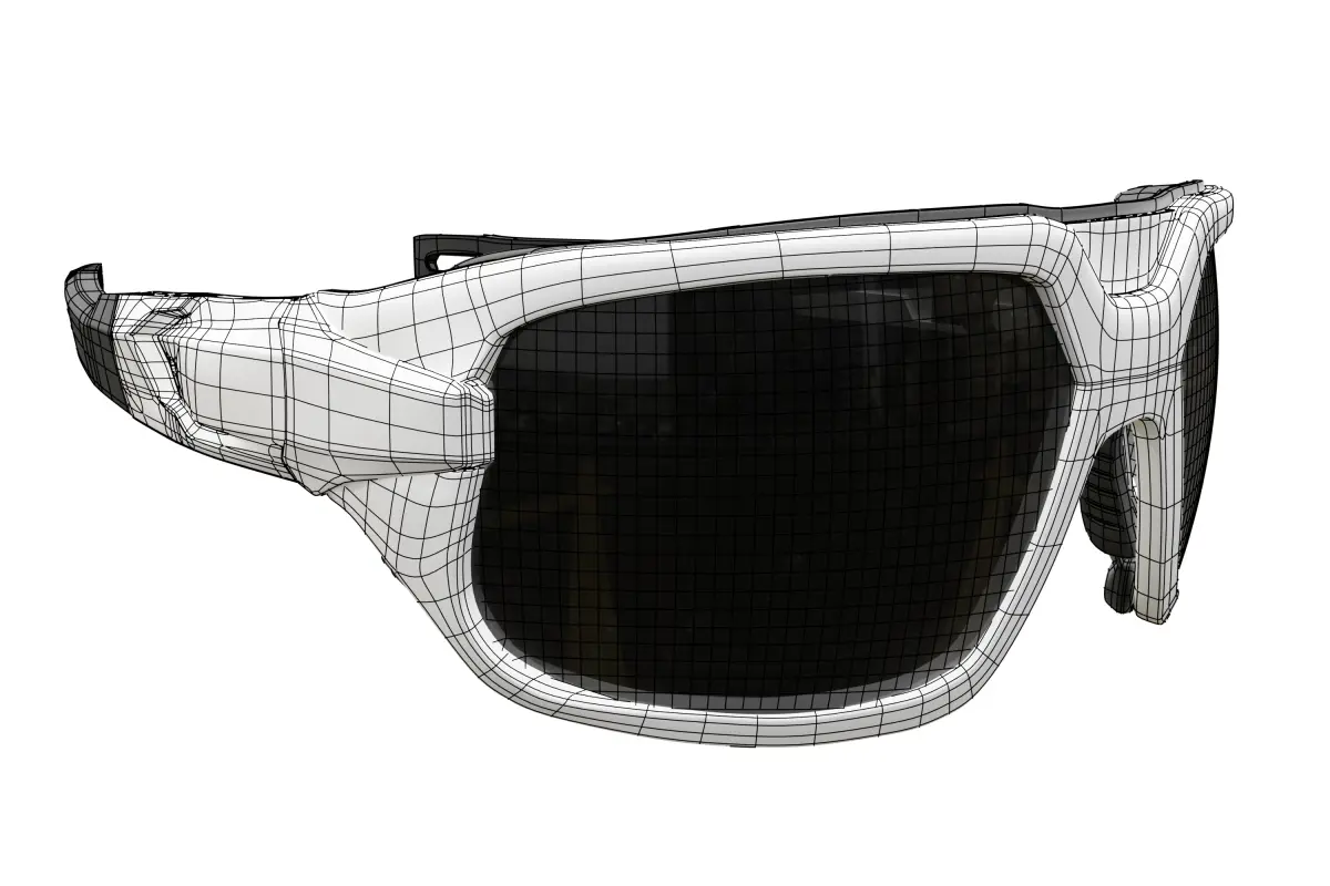This is a 3D model of a pair of modern sports sunglasses featuring a sleek white frame and dark lenses, created natively in Blender. The design incorporates a streamlined, ergonomic shape. Please note that this model does not have UV unwrapping and includes several subdivision surface modifiers still applied, allowing for further detail adjustments in Blender. The materials are set up within Blender. This asset is suitable for Blender users and can be adapted for athletic visualizations, character design, and product showcases. The wireframe image is provided to show the underlying geometry.