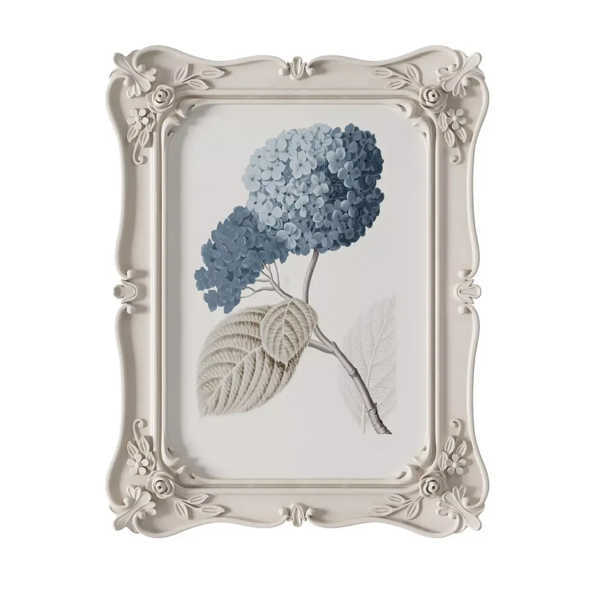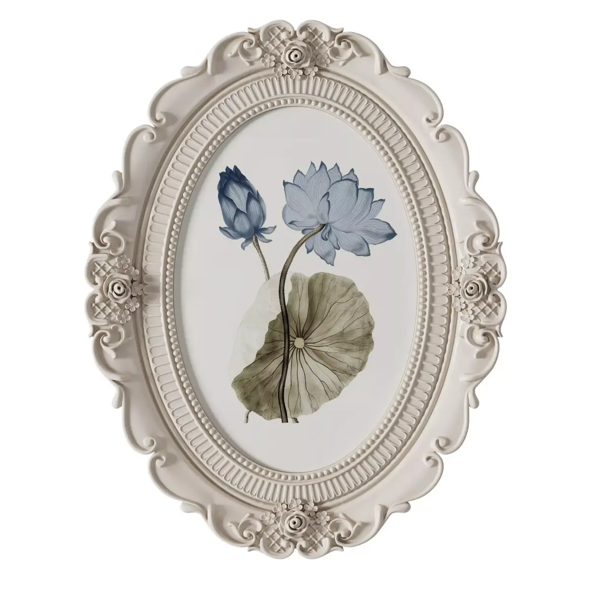Classic pictures in classic white carved frames for interior4 frames in different shapes with floral prints