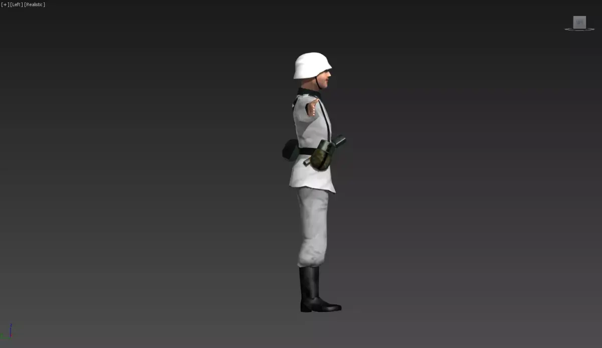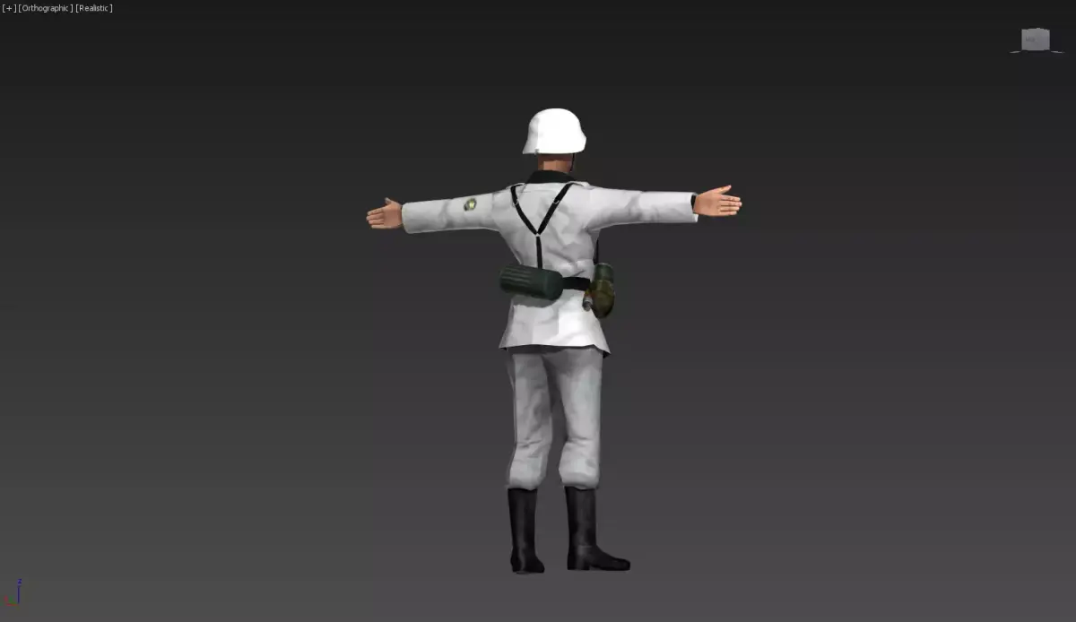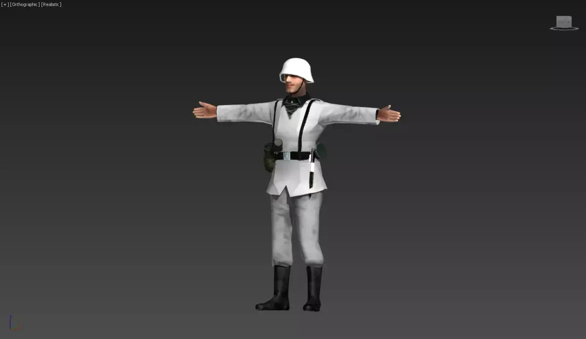 A clean, early-war infantry officer in a classic World War II-inspired uniform.Appearance: light gray/white tunic with a belt, tall boots, and a white helmet. The figure is in a neutral T-pose with arms extended.Gear: a small pouch and utility items attached to the belt, suggesting field readiness without heavy armor.Materials & textures: smooth fabric-like surfaces with subtle creases for realism; reinforced belt and glossy boots to provide contrast.Character vibe: disciplined, standard-issue frontline soldier, ready for training, briefing, or mission cold-start scenes.Tags3D modelinfantrymilitary uniformhelmetbeltbootsfront-linestylized realismhumanoid figureT-pose