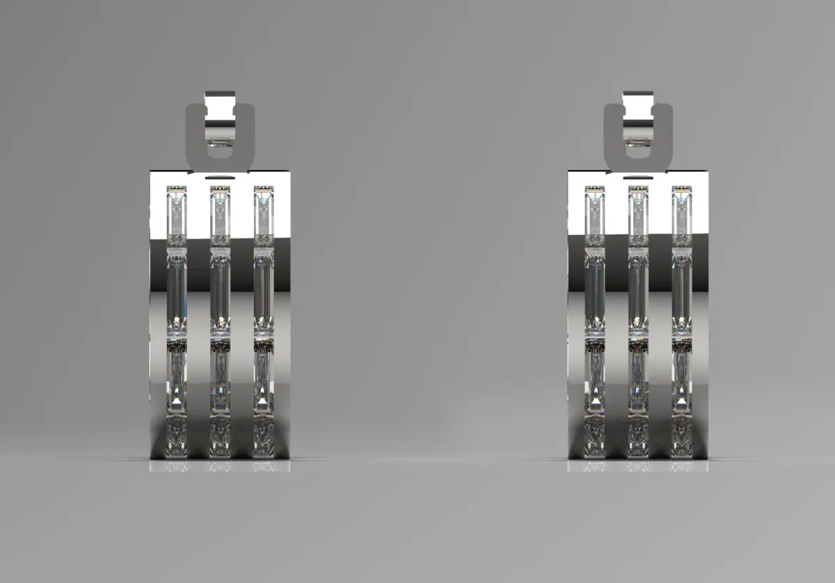 These earrings are crafted with utmost care from white gold or platinum with a mirror finish. Its main body is a thick, polished hoop with two parallel grooves on its outer surface. Inside these grooves, Baguette Cut diamonds are worked in a linear and regular manner in the Channel Setting technique. This method not only ensures the security of the stones but also displays a different shine that comes from the geometric lines of these diamonds.
