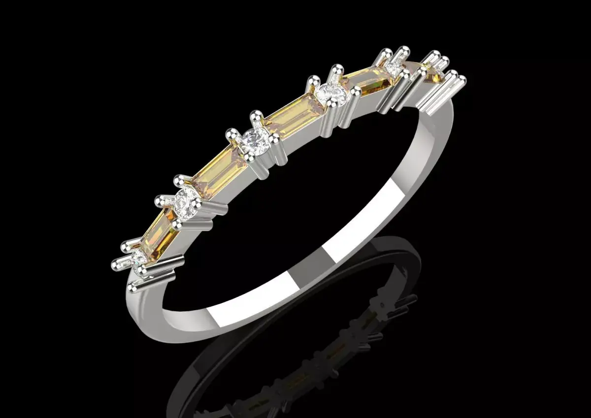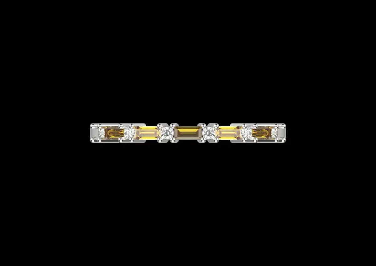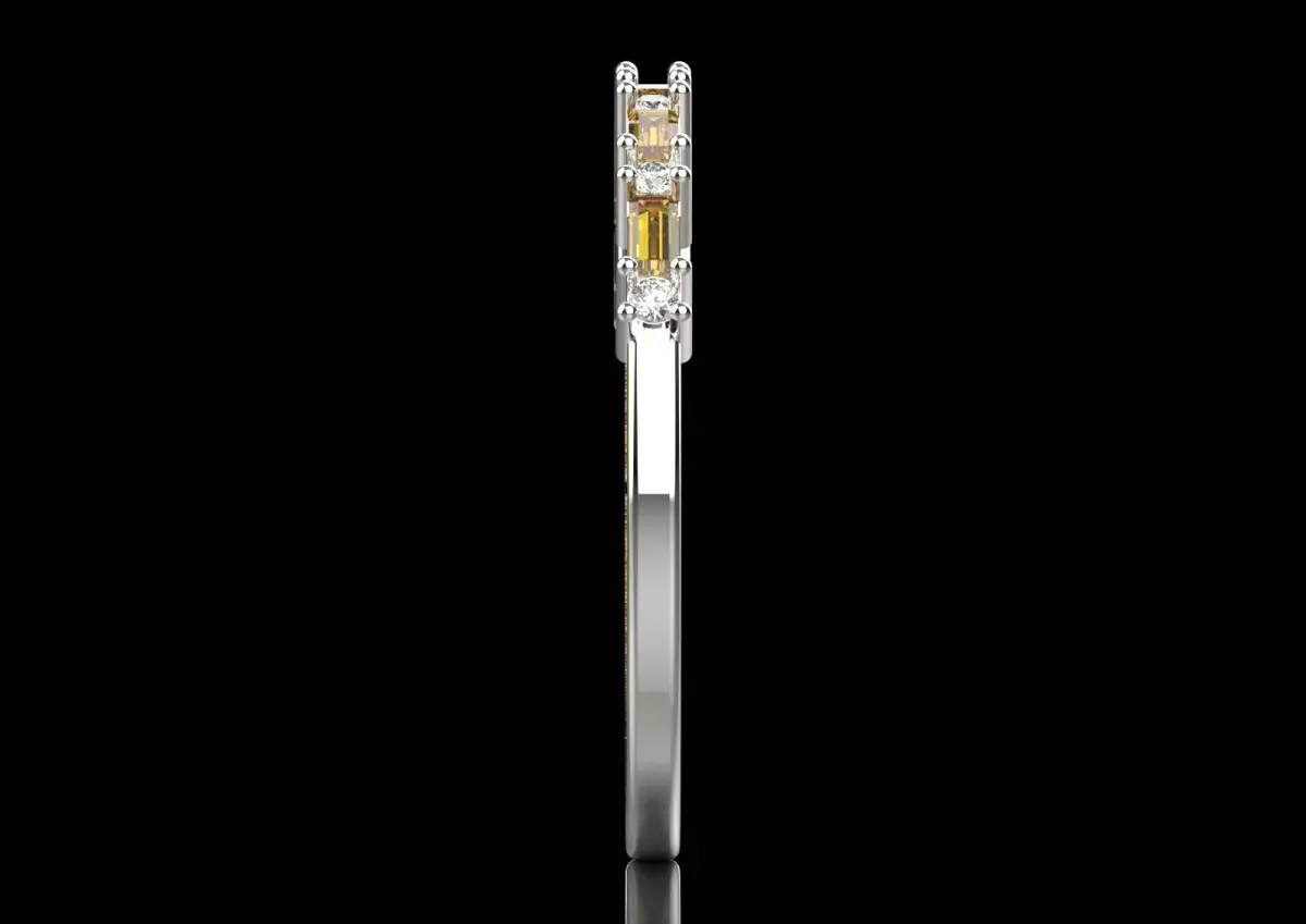 This ring is professionally made of polished white gold. Its surface is adorned with a harmonious combination of round brilliant-cut diamonds and yellow baguette-cut stones. Each gemstone is individually placed in delicate and sturdy bases, which this type of Prong Setting helps to maximize the reflection of light from all angles of the stones. This setting allows the sparkle and shine of the diamonds and yellow stones to shine through, creating a captivating beauty.