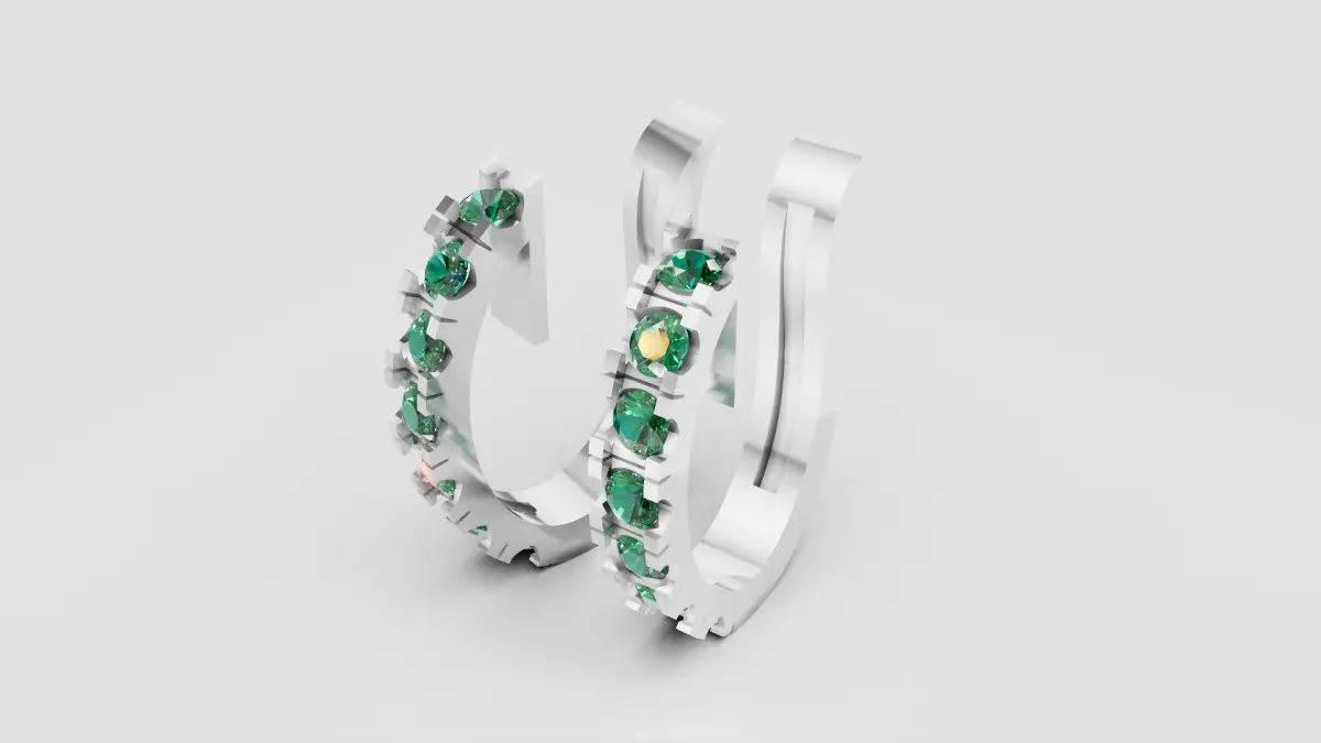 These elegant hoop earrings feature a modern, sleek design crafted in polished white gold or platinum. Each earring is beautifully adorned with a continuous row of brilliant round-cut green gemstones, securely prong-set to maximize light reflection and sparkle. The clean lines and vibrant gemstones give these hoops a sophisticated yet vibrant appeal, making them perfect for both everyday wear and special occasions. A timeless design that adds a pop of color and luxury to any jewelry collection.