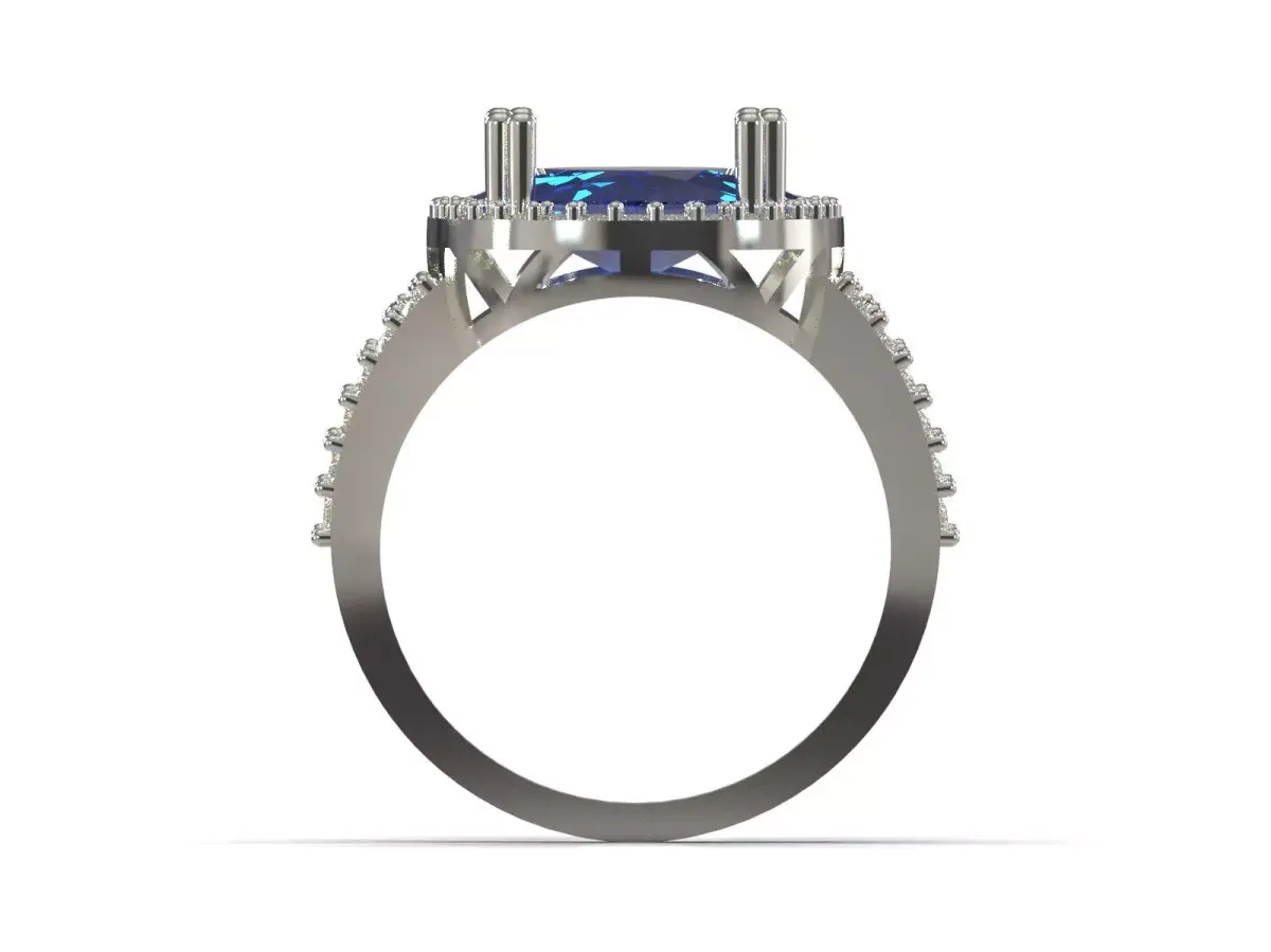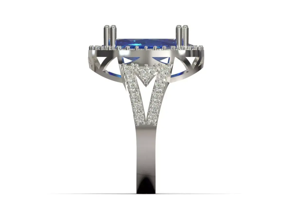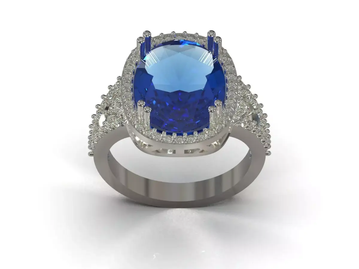 This beautiful ring features an oval sapphire at its center, surrounded by white diamonds. The ring's frame is made of high-quality white gold, which enhances the blue color of the sapphire and creates a stylish and timeless design. The band is decorated with diamond details, which adds to the beauty and brilliance of this luxurious piece.