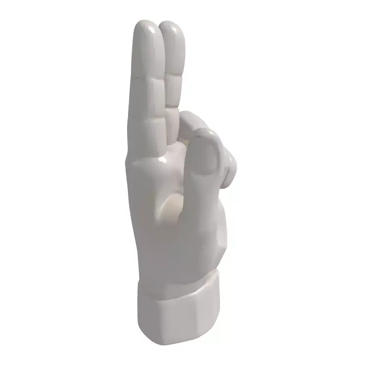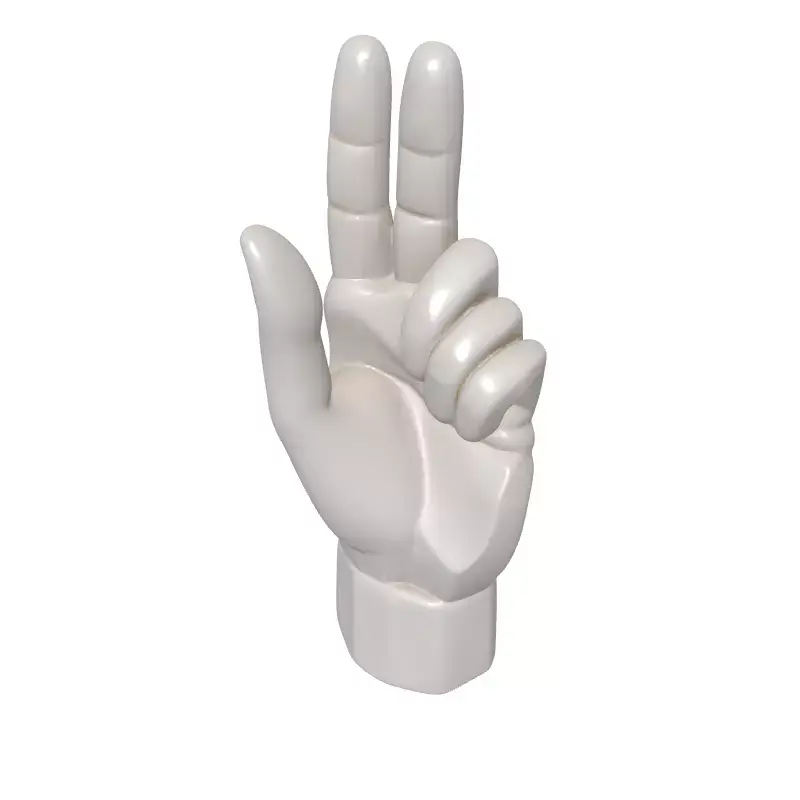 This highly detailed 3D model presents a stylized white hand sculpture performing the iconic peace or victory gesture. Crafted with clean topology and a smooth, elegant finish, this model is ideal for a wide range of creative projects. Its minimalist design makes it a versatile decorative asset for modern interior design renderings, architectural visualization, and digital art scenes. The model is optimized for both real-time applications such as game environments and augmented reality (AR) experiences, as well as high-quality static renders for product showcases or artistic compositions. It boasts a clean mesh, is UV unwrapped, and ready for further texturing or immediate integration into your projects as a pristine white object. Possible usage scenarios include virtual staging, art installations, educational content, or as a unique prop in a virtual museum. This asset is also suitable for 3D printing, allowing for the creation of physical decorative pieces. Supported file formats include GLB, OBJ, STL, ABC, DAE, FBX, USD, and PLY, ensuring broad compatibility across various 3D software and engines. The model's refined geometry ensures excellent visual fidelity in close-up shots.