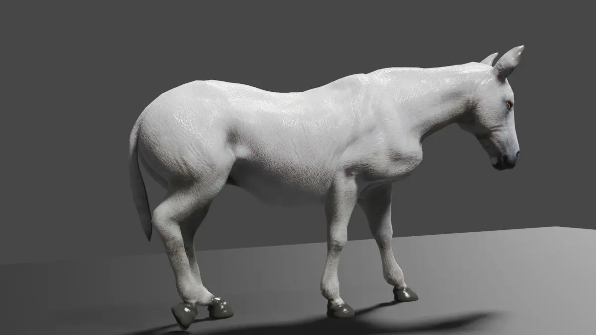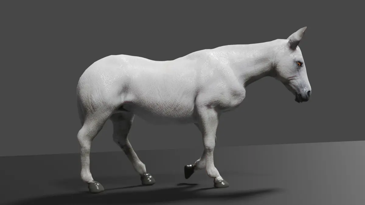 WHITE HORSE ANIMATED IN BLENDER. THIS IS A LOWPOLY MODEL OF A WHITE HORSE ANIMATED IN BLENDER. IT HAS A SINGLE NLA ANIMATION STRIP 32 FRAMES LONG AND IS REPEATED FOR 404 FRAMES. THE TEXTURE FILES WHICH ARE 4096X4096 ARE EMBEDDED WITHIN THE BLENDER FILE.
