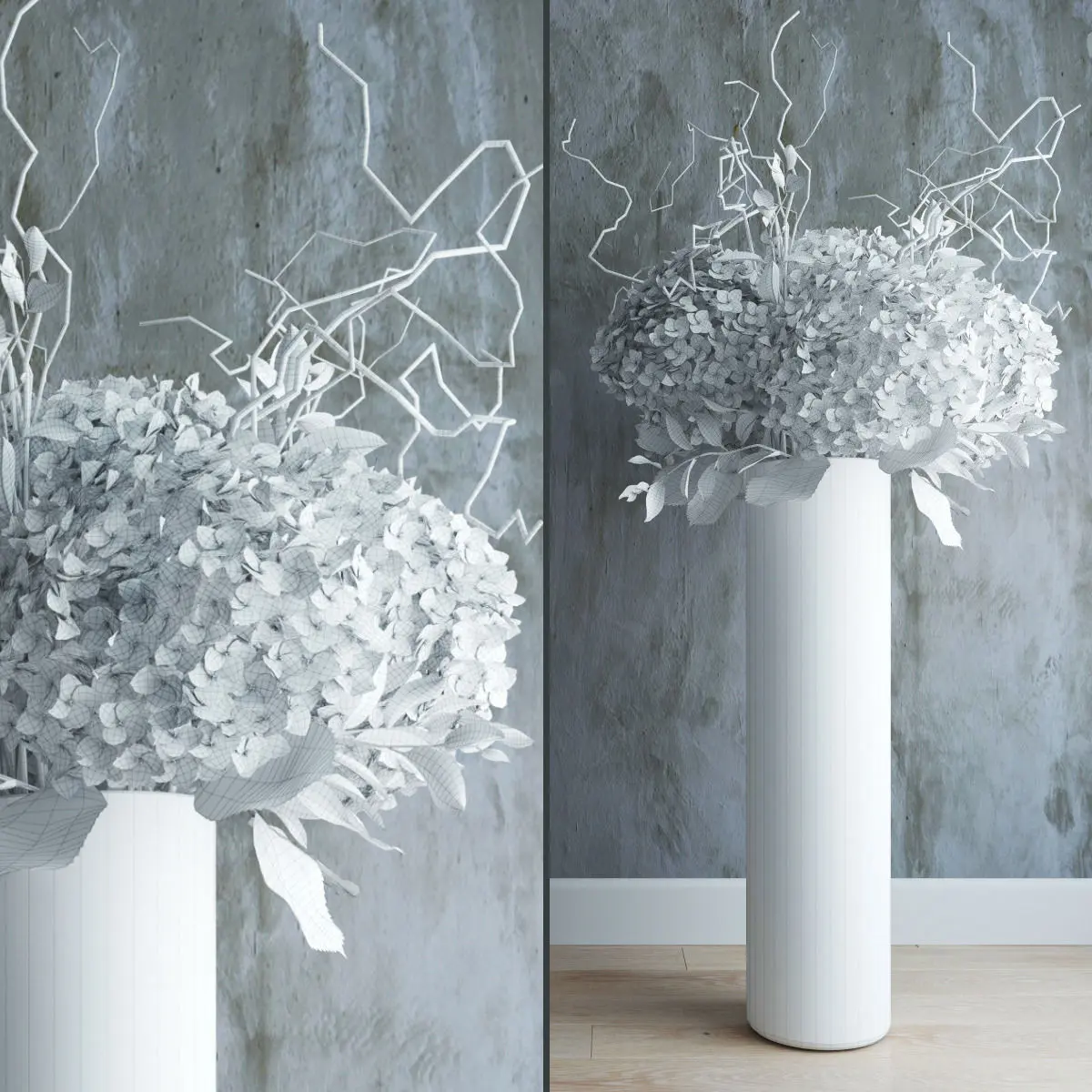Bouquet of 5 white branches of hydrangeas, willow and tangerine branches. The model consists of a square polygon. Before the start of rendering you need to turn on the bulb lights on TurboSmooth.