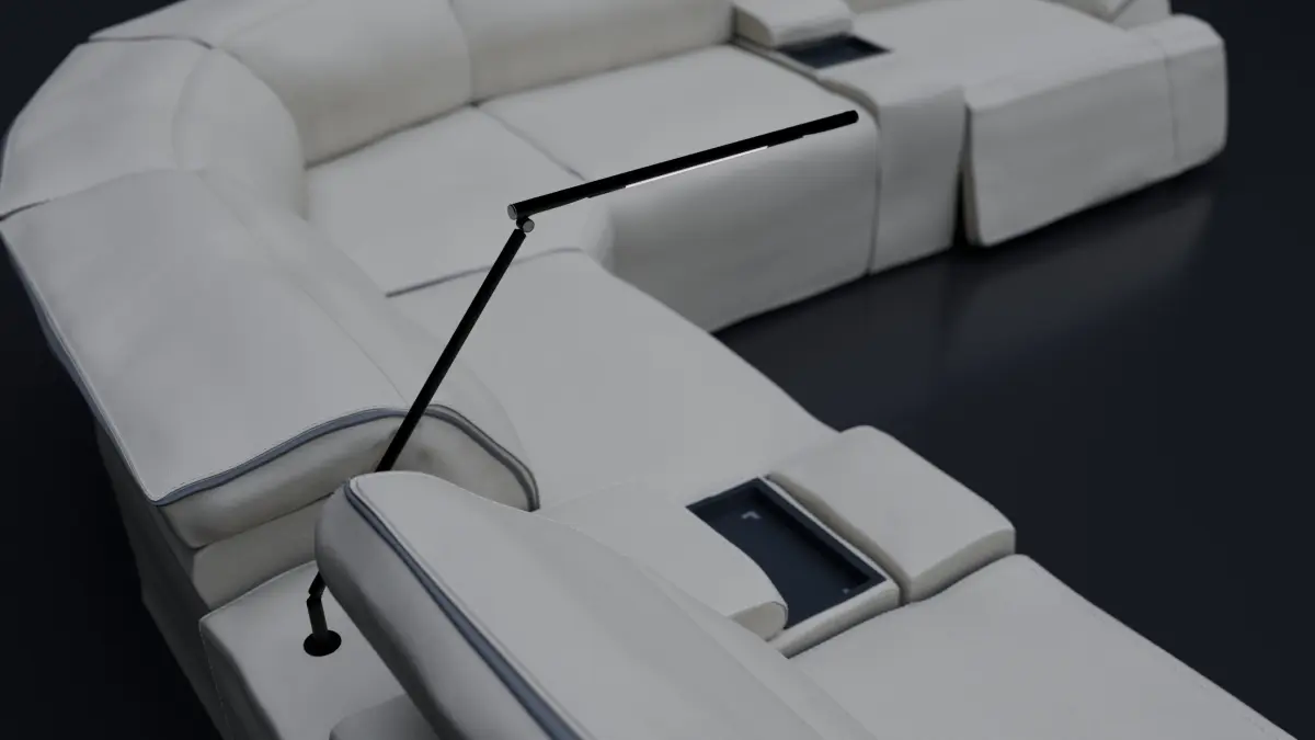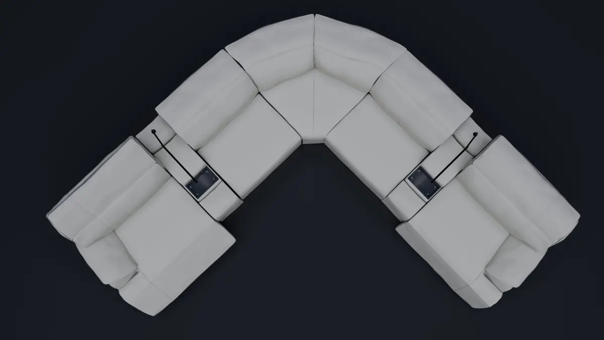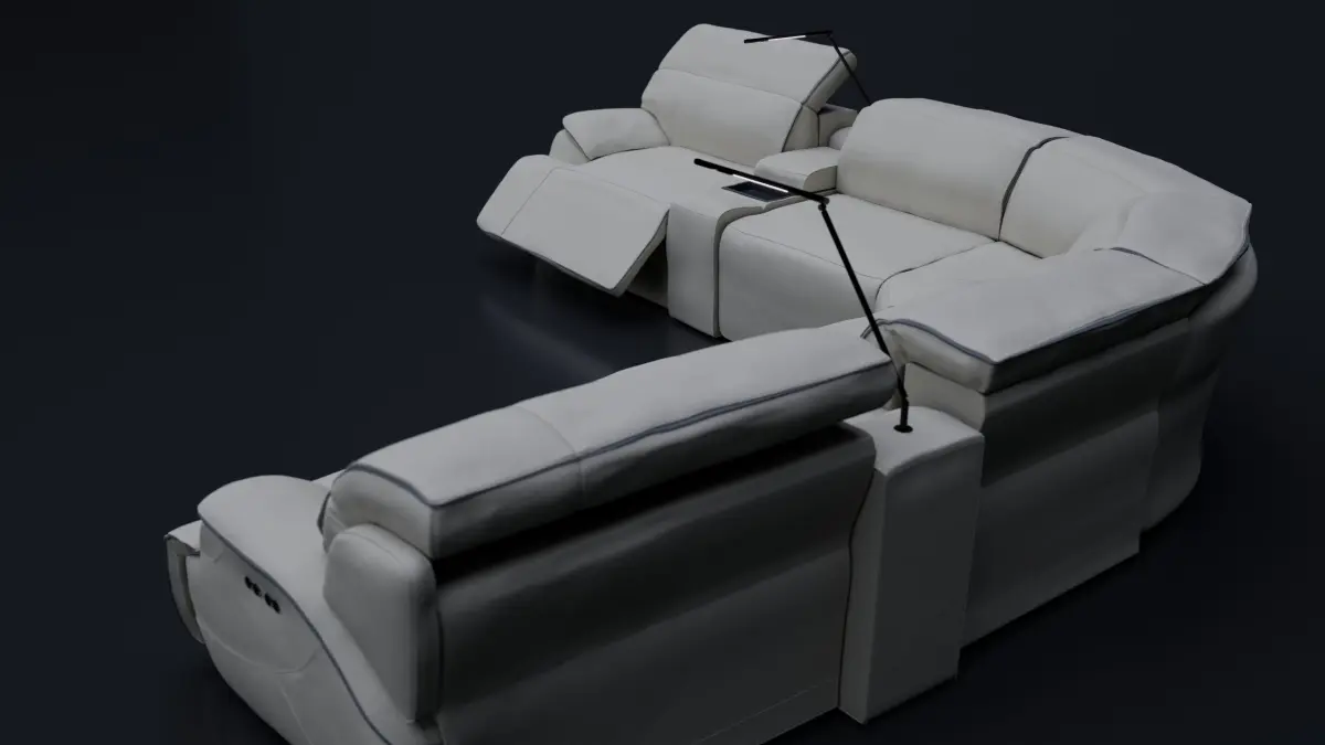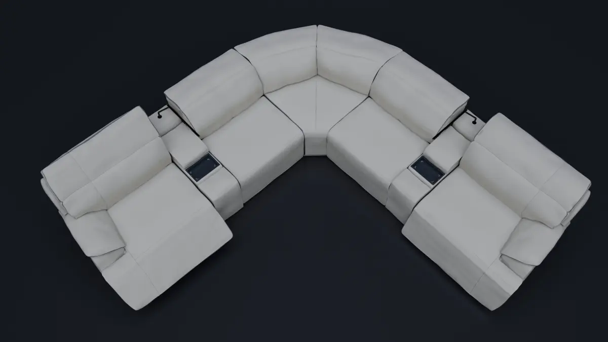 Modern style livingroom couch that consist in 7 very detail pieces that includes usb type a and type c smarthphone chargers, lights and cup holders.