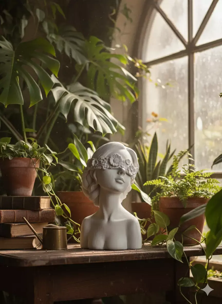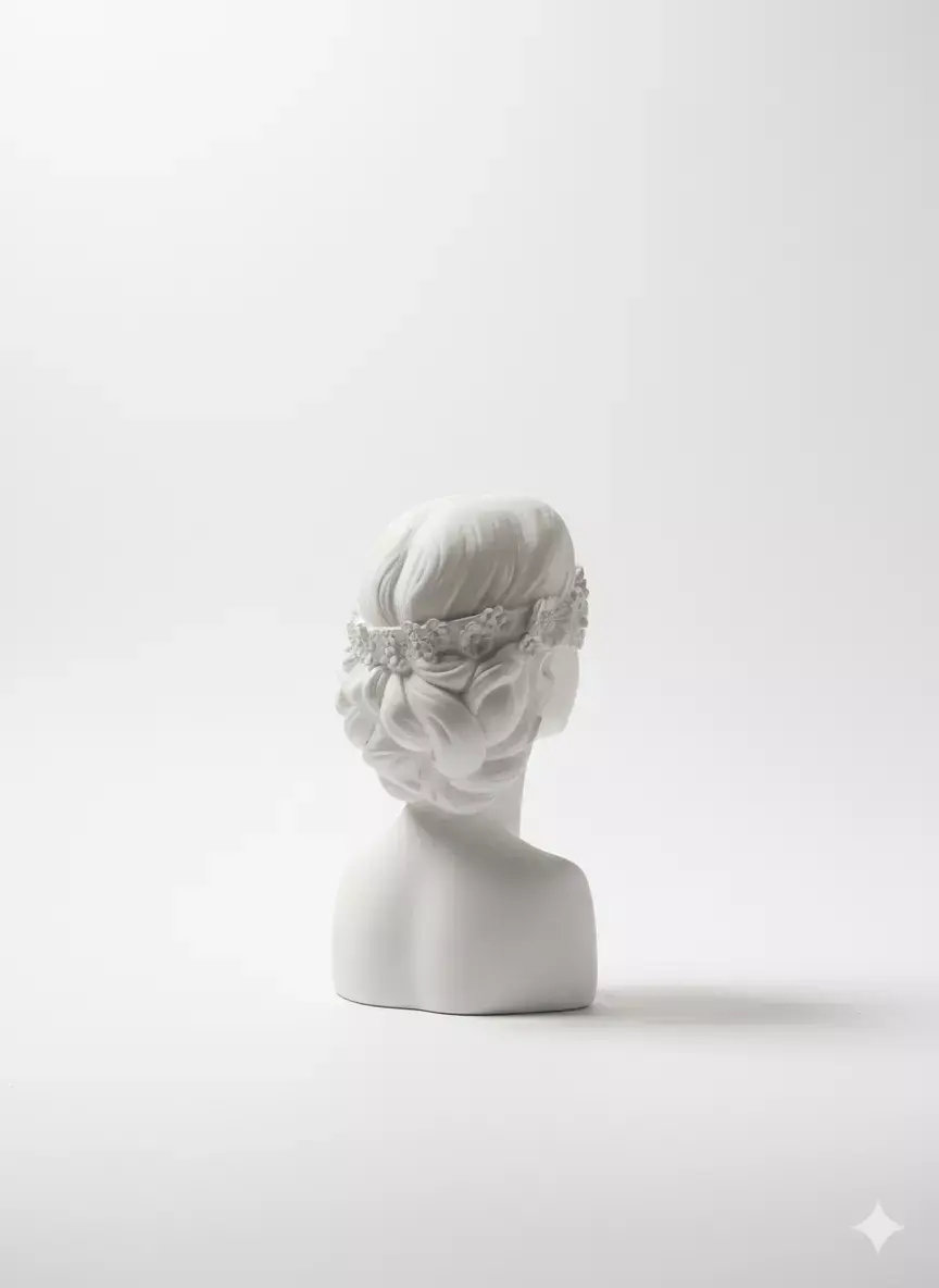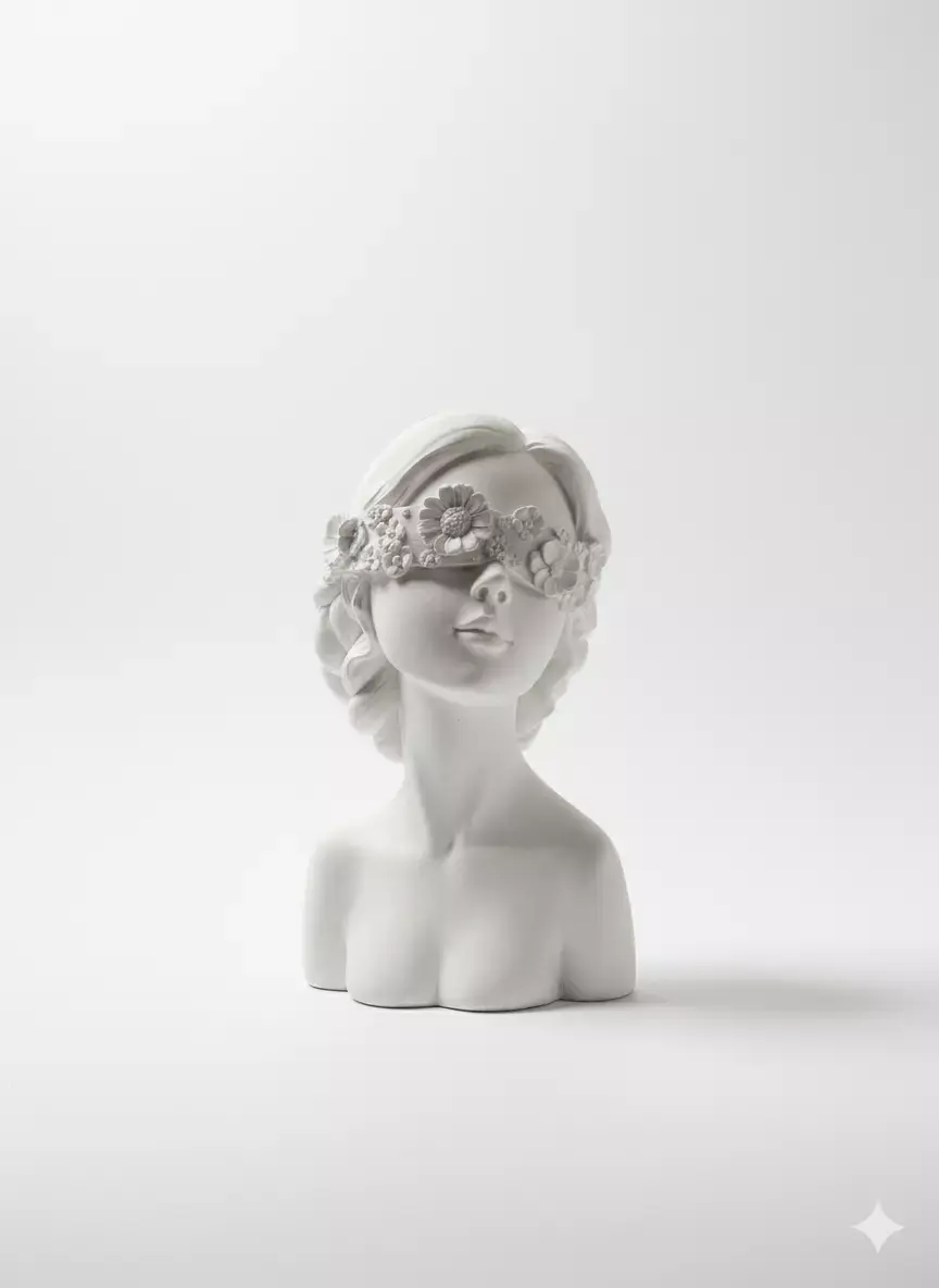 Elegant 3D model of a classical-style female bust sculpture, crafted in smooth white marble texture, featuring a serene and graceful expression. The figure is adorned with an intricately detailed floral blindfold across the eyes, composed of delicately carved blossoms and leaves, symbolizing beauty, tranquility, or sensory transcendence. Her hair is styled in soft, flowing waves with a braided detail on one side, enhancing the artistic and romantic aesthetic. The sculpture captures fine facial features—soft lips, defined cheekbones, and a gently tilted head—evoking a sense of calm contemplation. The bust includes the upper torso, shoulders, and neck, with natural proportions and subtle anatomical details that highlight craftsmanship. Ideal for interior design, art installations, home decor, or digital art projects, this model brings a touch of timeless elegance to any environment. Rendered with high-resolution PBR materials, including albedo, roughness, normal, and ambient occlusion maps, it supports realistic lighting and shadows in engines like Blender, Maya, Unreal Engine, or Unity. Perfect for use in architectural visualizations, museum displays, or as a decorative asset in VR/AR experiences. The model is optimized for both static display and animation, with clean topology and UV mapping for easy texturing and customization. A stunning piece for artists, designers, and collectors seeking refined, sculptural content.