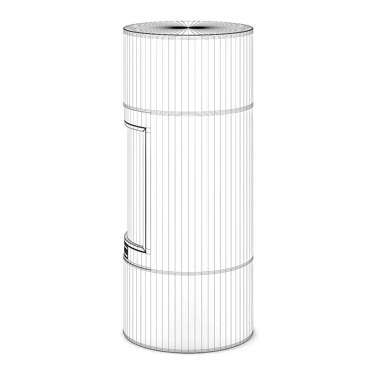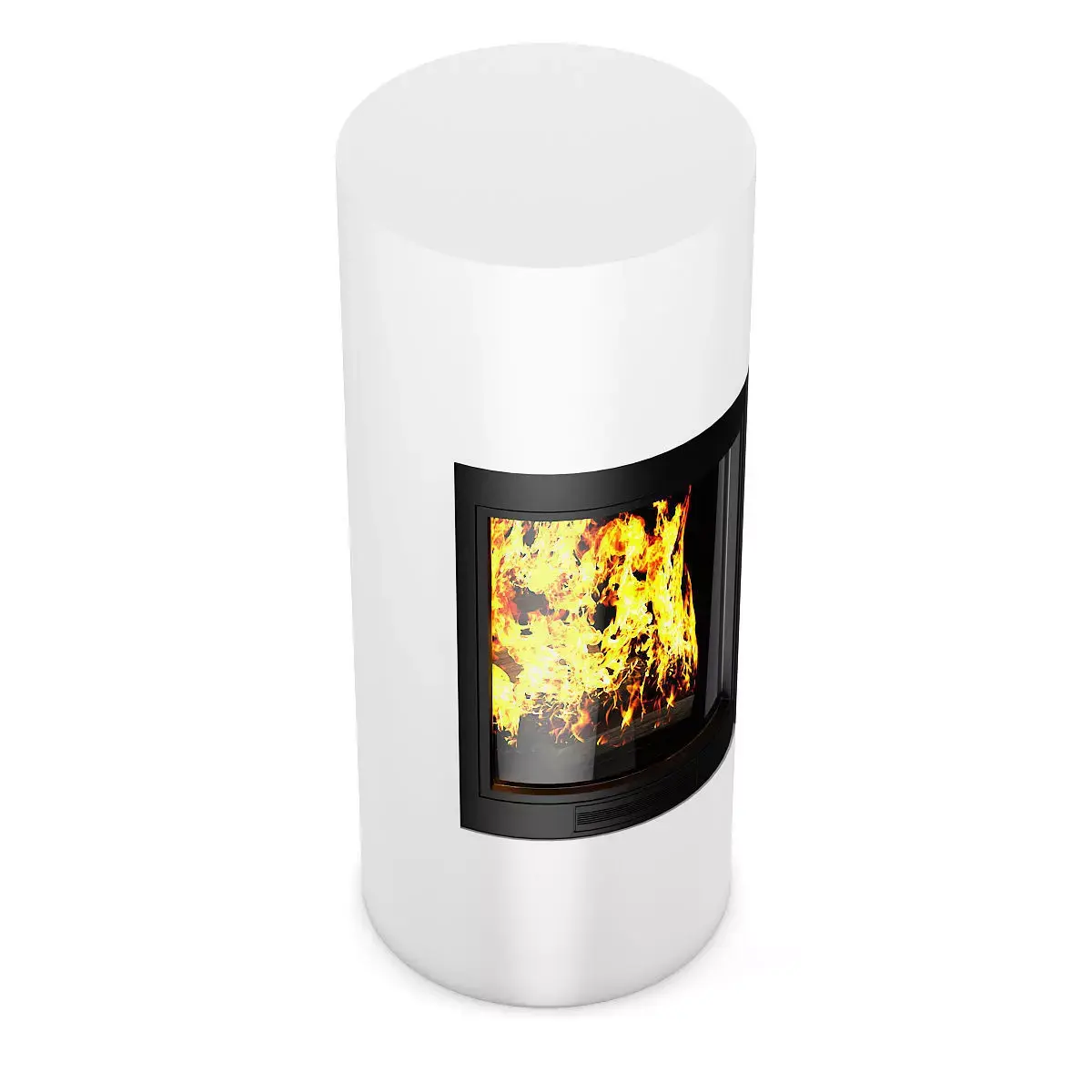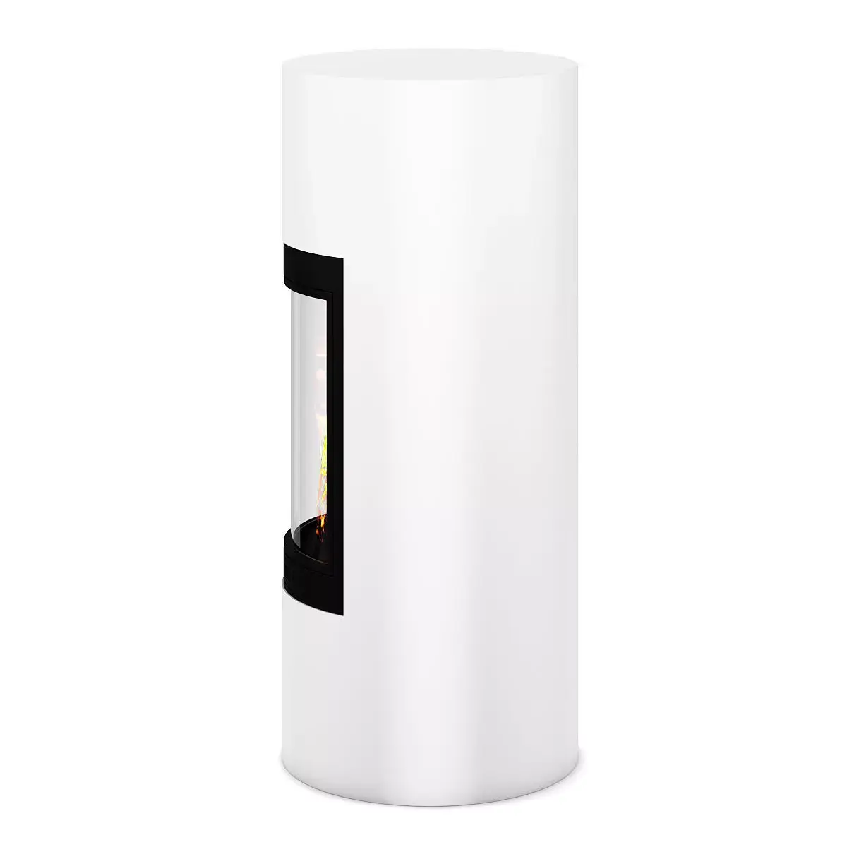 Modern looking white fireplace in cylindrical shape. This 3D model contains illuminative fire material.