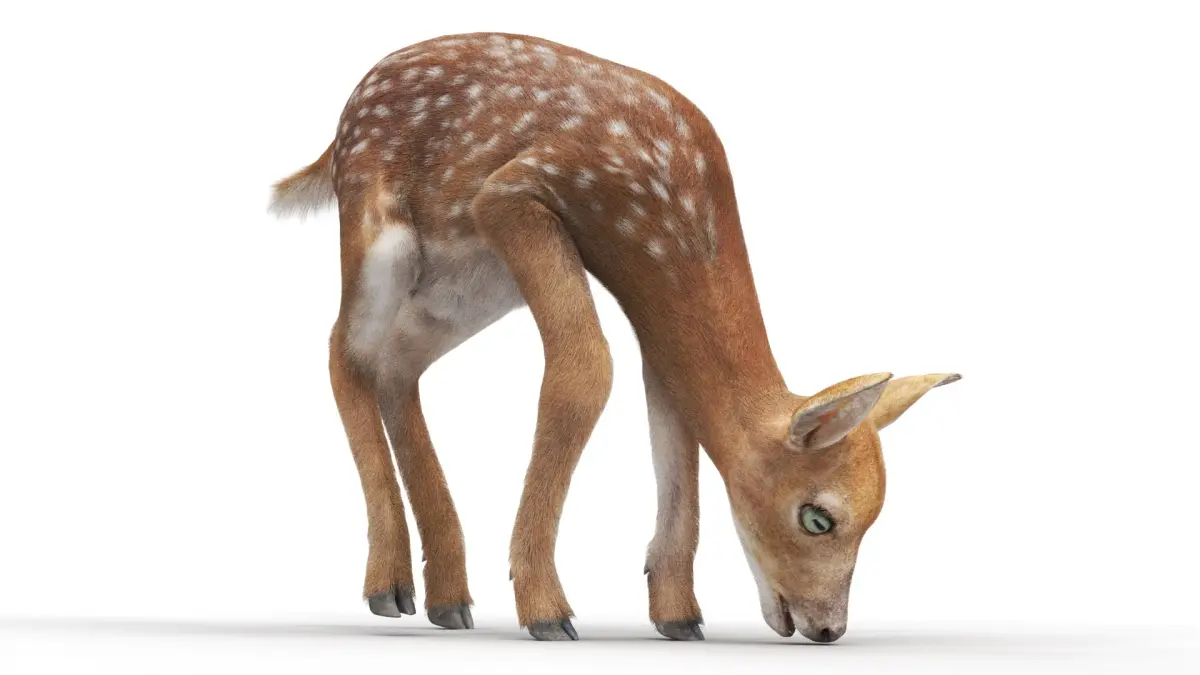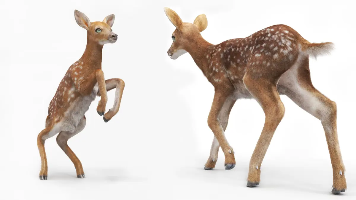 White-Tailed Fawn Deer Walking Fur Animated Rigged for Maya is a three-dimensional model of white-tailed fawn (deer baby), that is a white-tailed deer baby (Odocoileus virginianus), and that is a young deer known for its spotted coat and gentle, timid nature.