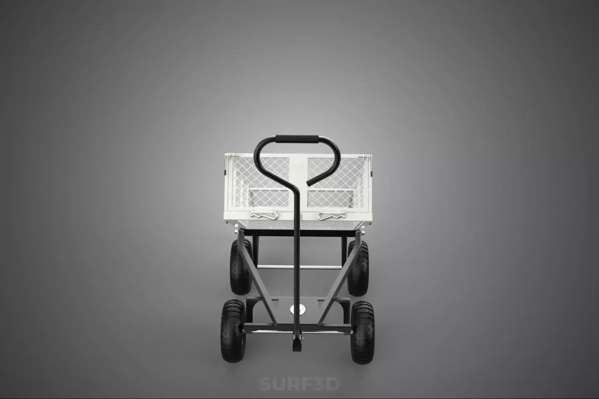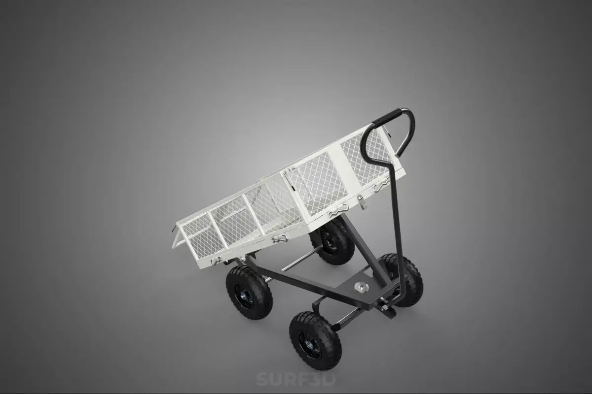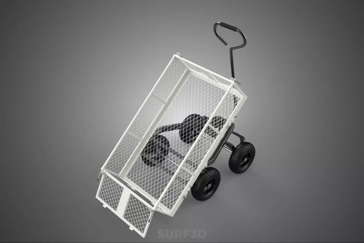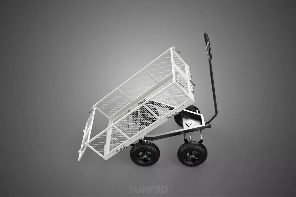 This device is fundamentally a robust, manually operated or towed transport cart characterized by a dedicated dumping mechanism. It is distinguished from standard flatbed trolleys or hand trucks by its open, perforated cargo bed and the ability to unload its contents through gravity-assisted pivoting. Common industry nomenclature includes utility dump wagon, tipping trolley, or grid-mesh garden cart. The specified white color typically indicates a protective, highly visible finish, usually applied through powder coating to maximize resistance against abrasion, rust, and environmental degradation.