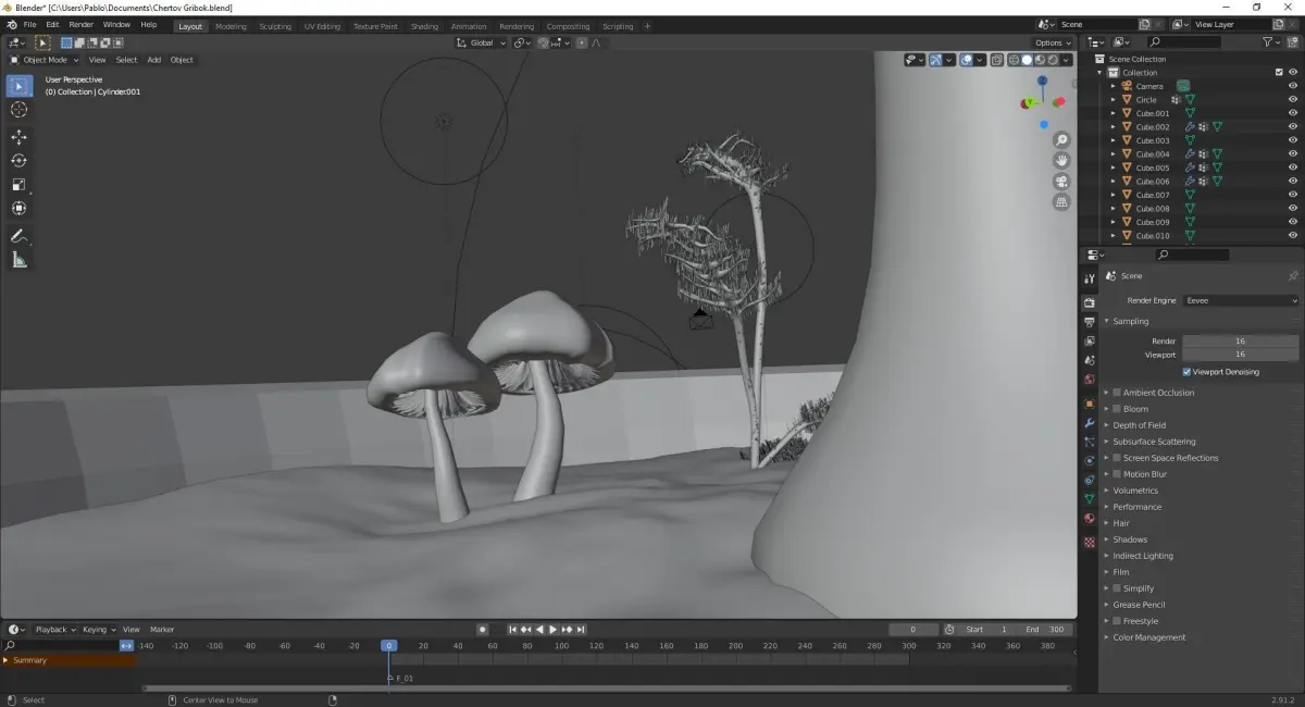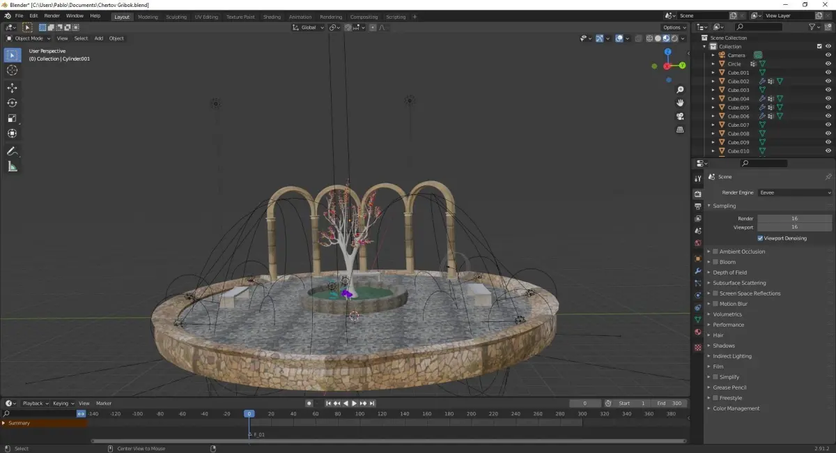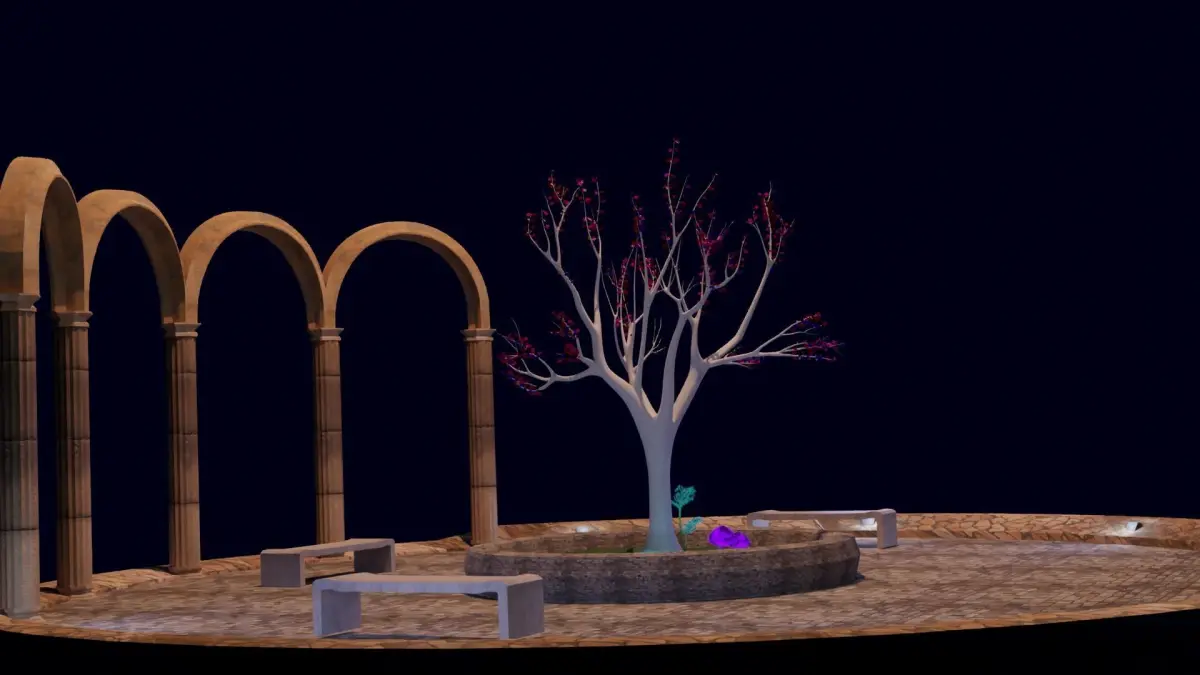 White tree with purple mushrooms with ancient arch composition Free low-poly 3D model
