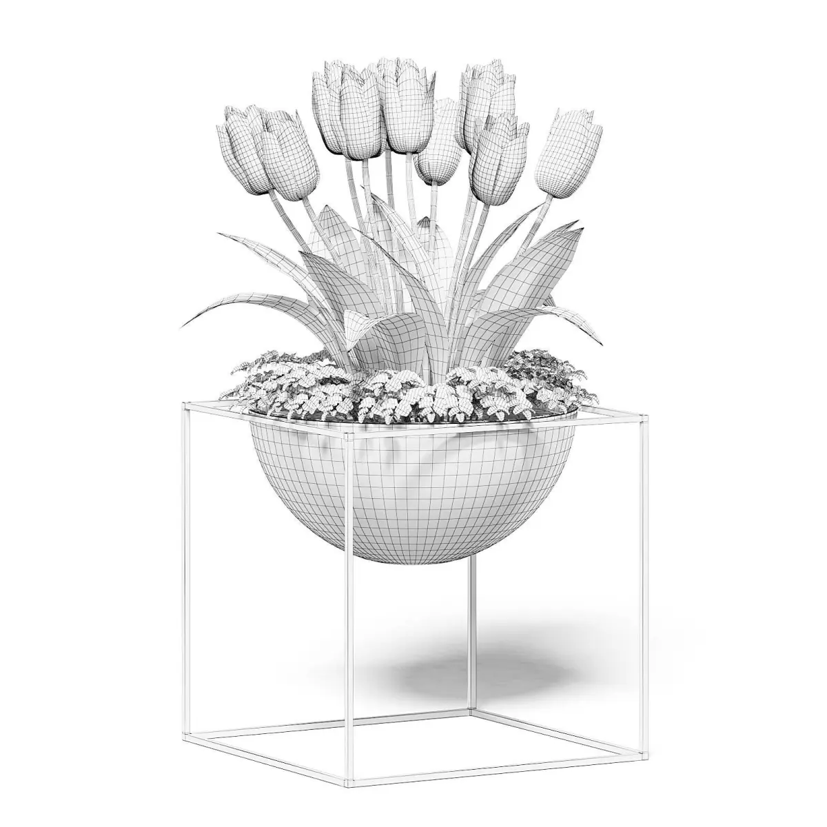 White tulpis 3d model in modern looking metal pot. Compatible with 3ds max 2010 (V-Ray, Mental Ray, Corona) or higher, Cinema 4D R15 (V-Ray, Advanced Renderer), Unreal Engine, FBX and OBJ.