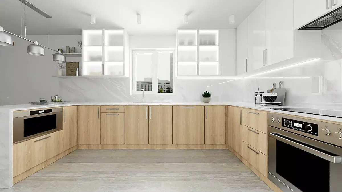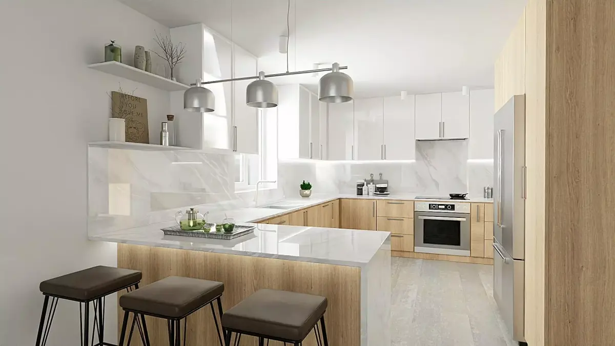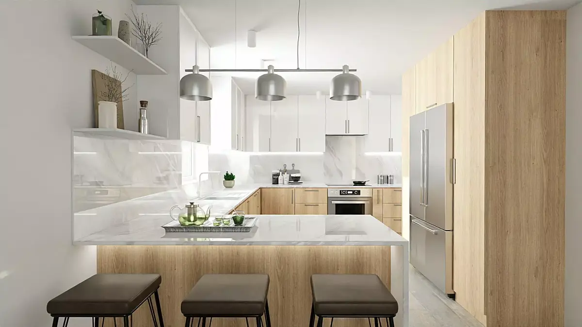 Model of a light, spacious modern kitchen with a large functional countertop and bar area, a large refrigerator.Light wood material was used for the cabinets and white marble for the countertops and floors. Which goes very well in spaces of this type. The model can be used both in the original, for visualization of projects, and remade for yourself.Room area is 23.3 m2