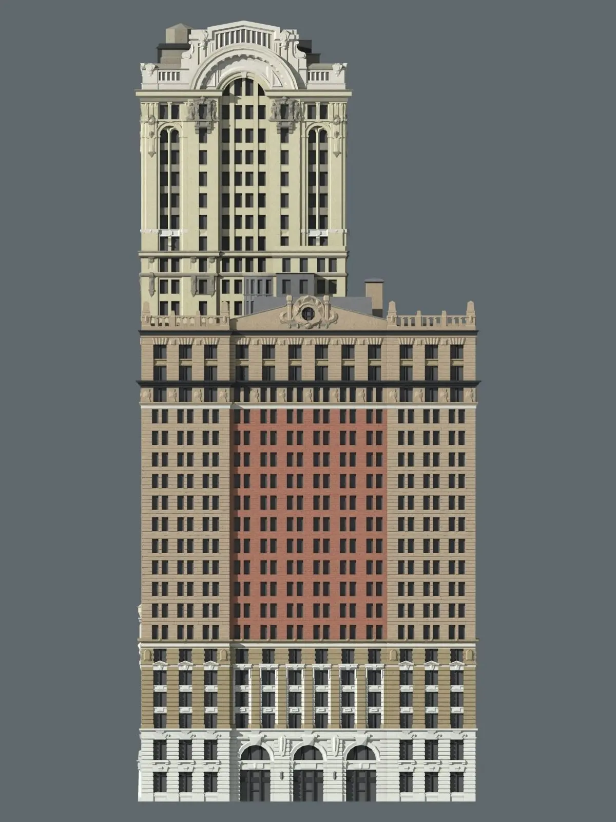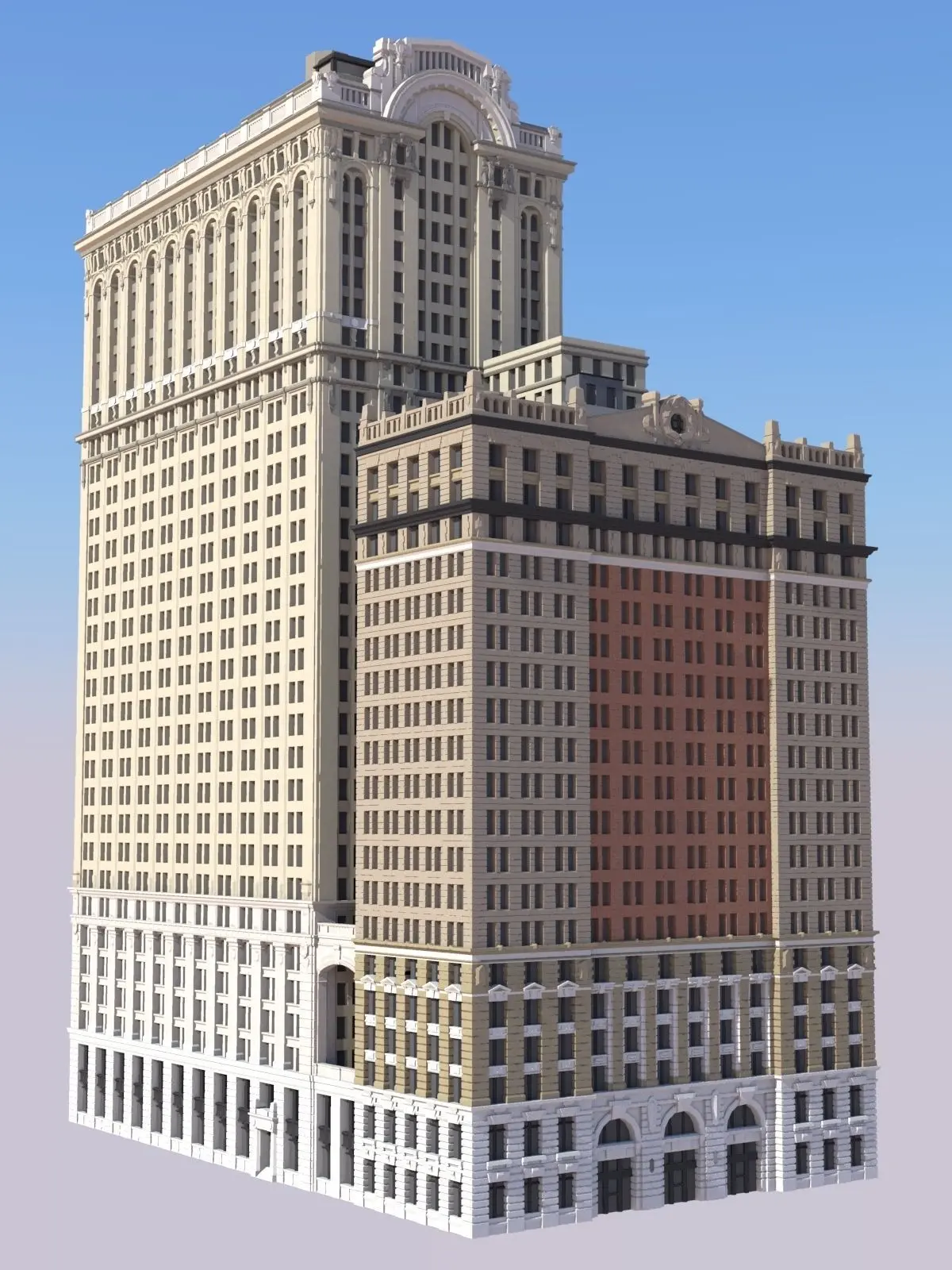 The Whitehall Building and Annex are two connected buildings near the southern tip of Manhattan in New York City's Financial District. The original building, built in 1904, was designed by architect Henry J. Hardenbergh. Seeing demand for more space, the developers quickly put together plans to expand. Architecture firm Clinton and Russell was commissioned to design the taller Whitehall Annex, completed in 1910.Both buildings are designed in the Beaux-Arts style, featuring such details as dramatic rounded arches, detailed sculpturing, and a vibrant mix of colored stone. At heights of roughly 275ft (83m) and 424ft (129m) respectively, the Whitehall Building and Annex were among the tallest buildings in the early days of New York City's race towards the sky. Then located along the westernmost edge of Manhattan, the buildings stood in a particularly prominent location.In the century-plus that has passed since construction, the building has faced wear and tear that has seen several architectural elements removed or damaged. This model intends to recreate the two buildings as they appeared in their original glory.