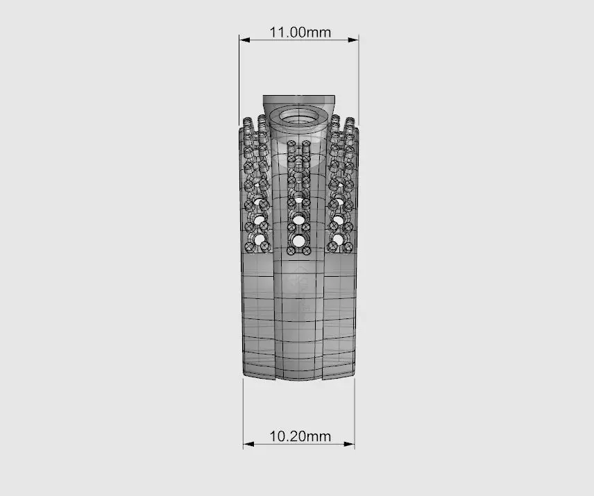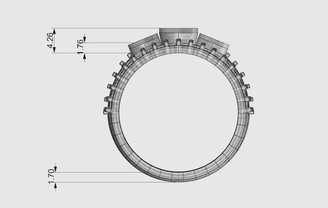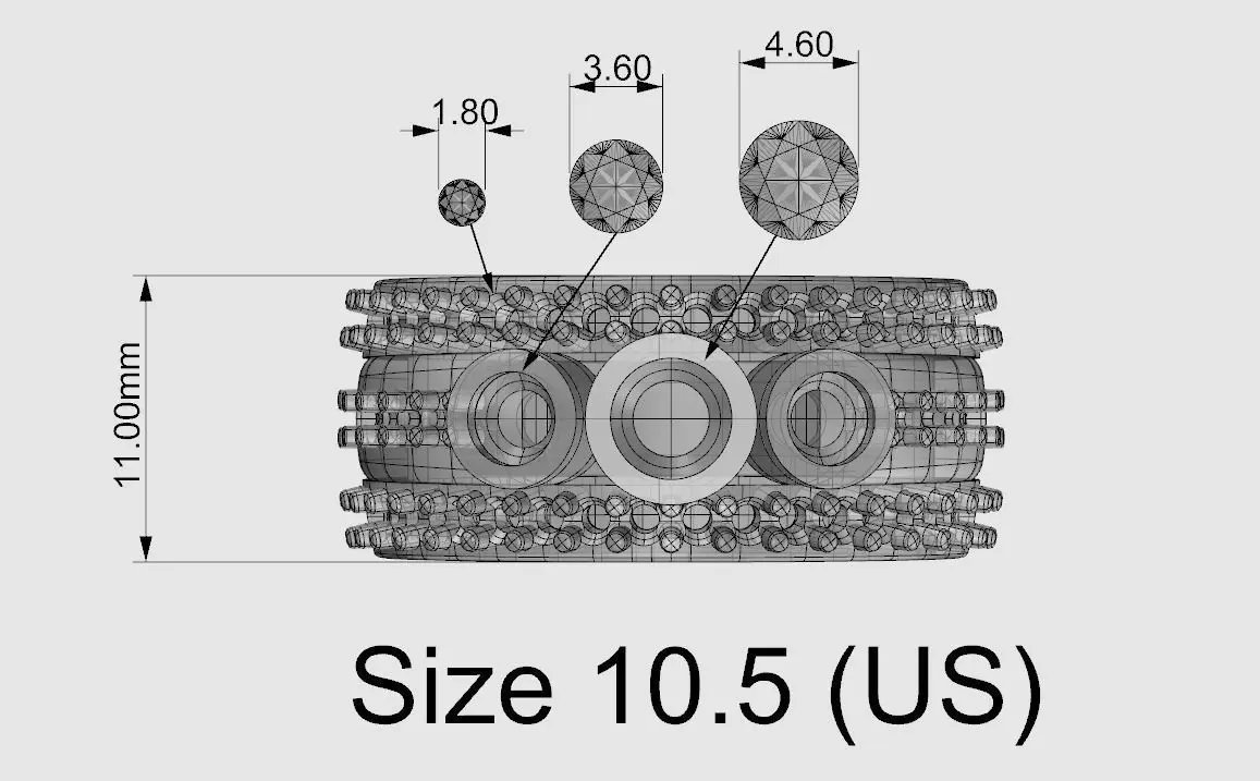 Approx 11mm total width with very slight taper. Three bezel set main stones in a wide band resembling three individual bands that are joined. 46x 1.80mm round stones, set with common claws. Approximate weigh based on finished model in 14K = 16 grams. **Both the render file with stones and the proto files in .3dm are included here.*