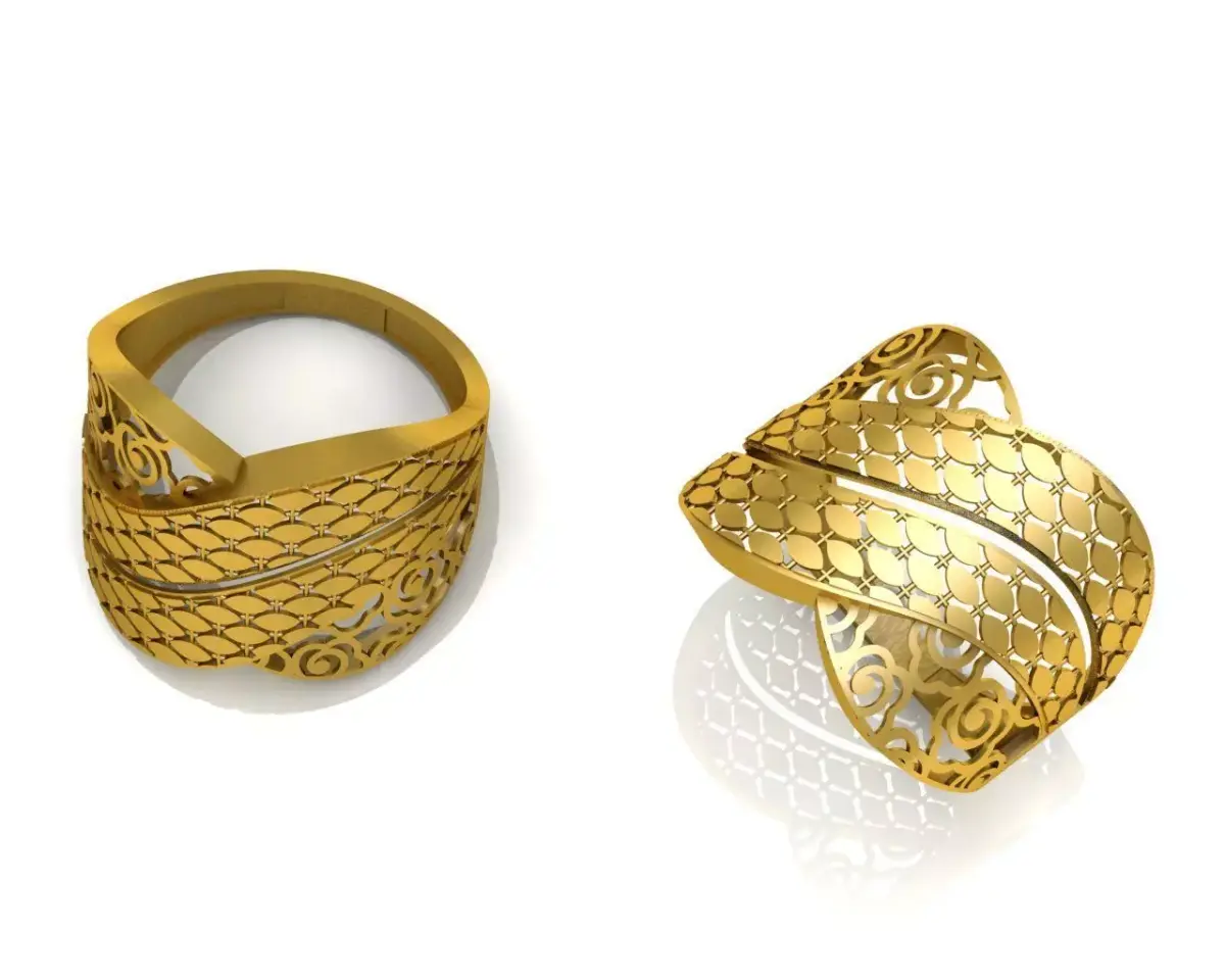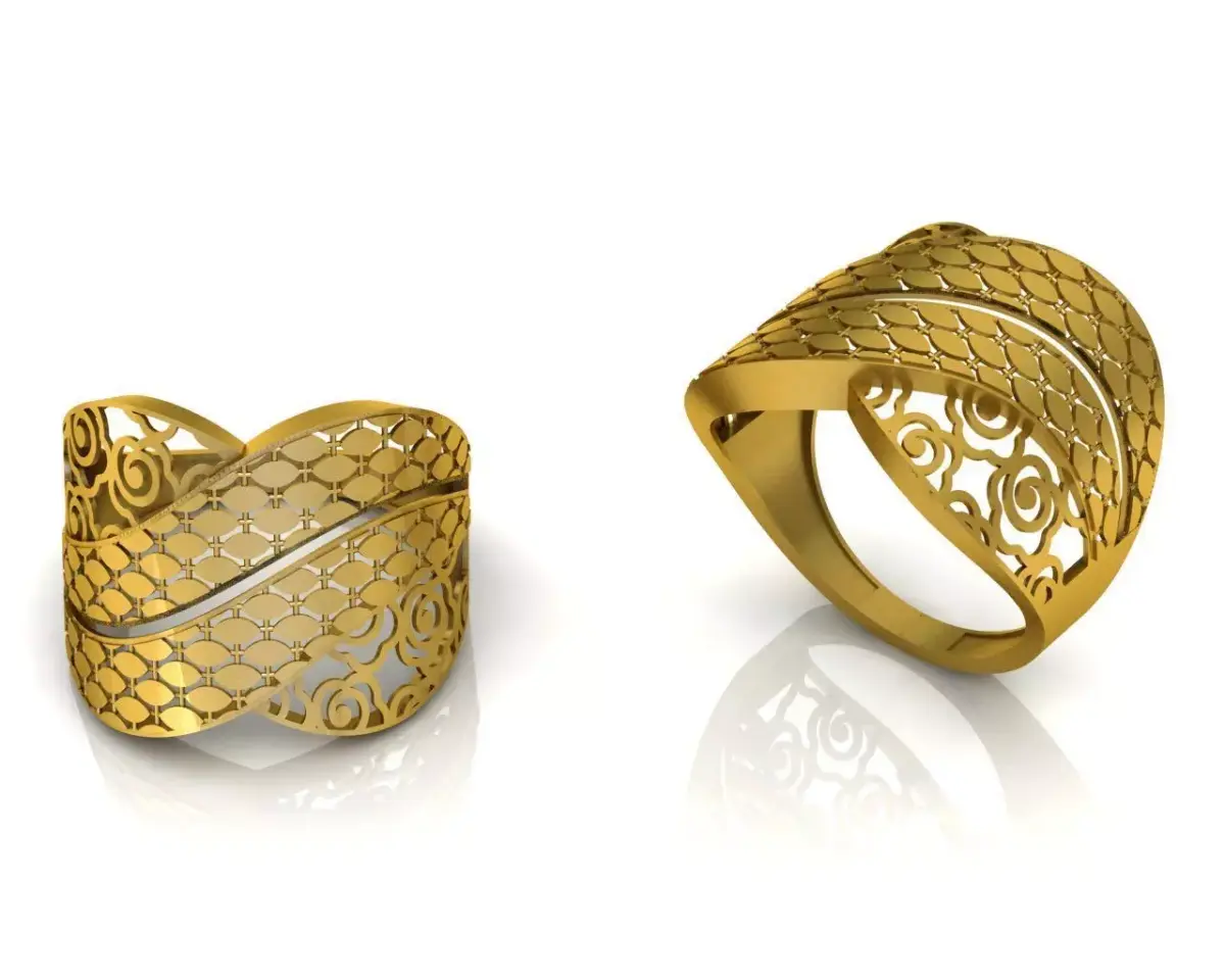 High-quality 3D jewelry design of a wide gold filigree ring.This statement ring features an elegant openwork lattice pattern, inspired by traditional filigree jewelry and optimized for modern laser cutting and casting processes.