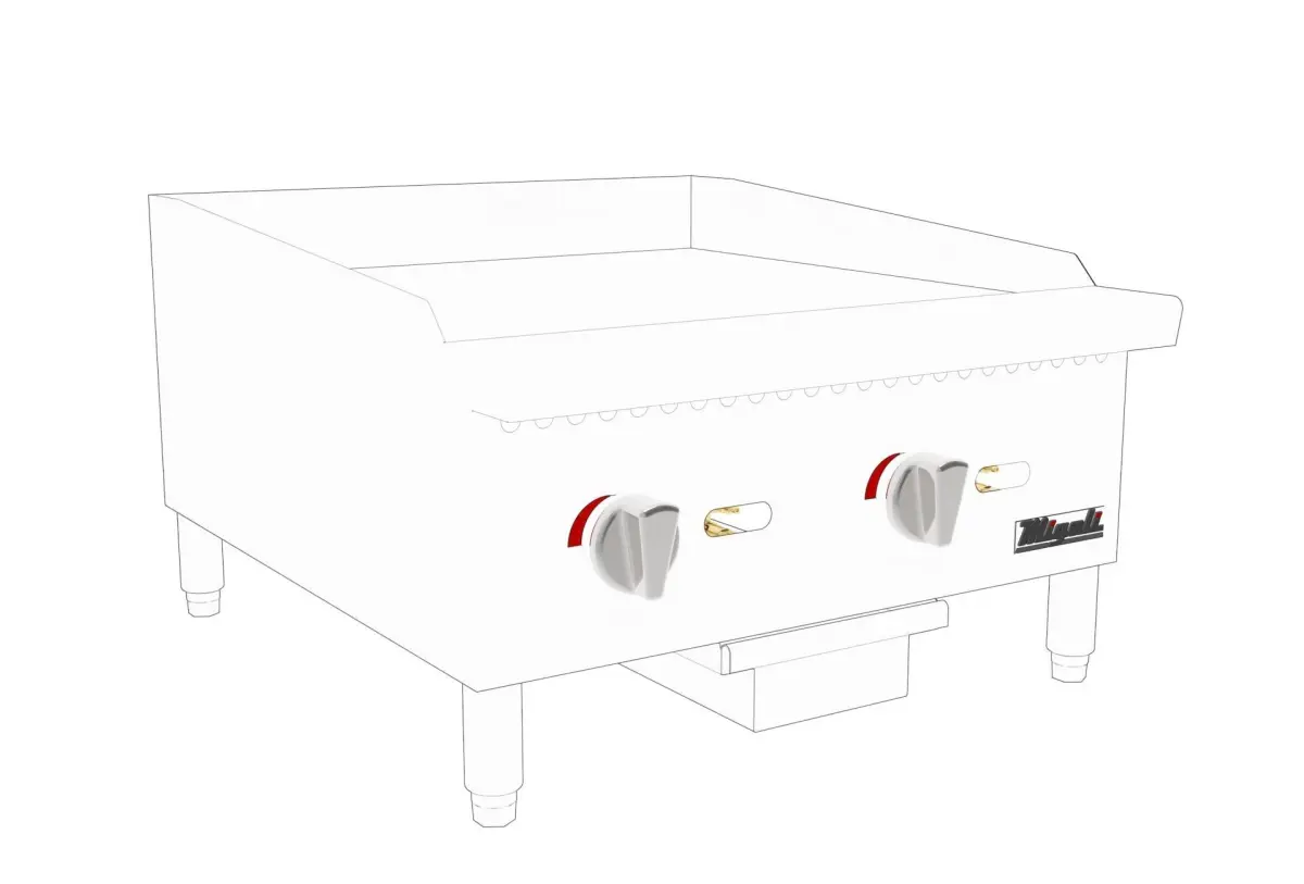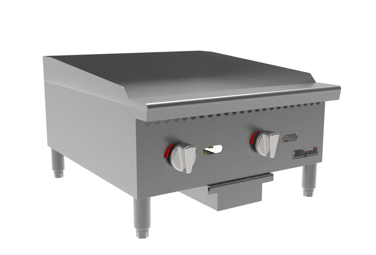 The Migali C-G24 24″ wide, manual griddle is essential to most commercial kitchens and restaurants. This model is designed with a 20″ deep, 3/4″ thick steel cooking surface and includes (2) chrome temperature knobs. Migali “U” shape burners are robust, creating an even temperature across the cooking surface. Finally, the C-G24 is also eye catching, boasting a high polished stainless steel exterior and interior, chrome accents and stainless steel adjustable legs.UPC 819296020612Exterior Width 24Exterior Depth 28.6Exterior Height 15.2Weight 160 lbsShipping Width 26.8Shipping Depth 31.1Shipping Height 18.2Shipping Weight 195 lbsNumber of Burners 2Total BTU 60000Power Type Natural Gas / Liquid PropaneBurner Style “U” shapeControl Type ManualCooking Surface Material 3/4″ SteelIgnition ManualValve Type Pilot LightBurner BTU 30000Working Area 23.9″ w x 19.9″ d x 3/4″ highIntake-tube Pressure (W.C.) Natural Gas 4Intake-tube Pressure (W.C.) LP 10Nozzle Number Natural Gas #37Nozzle NumberLP #51Gas Inlet Size 3/4″Number of Controls 2Temperature Range 200° F to 575° F